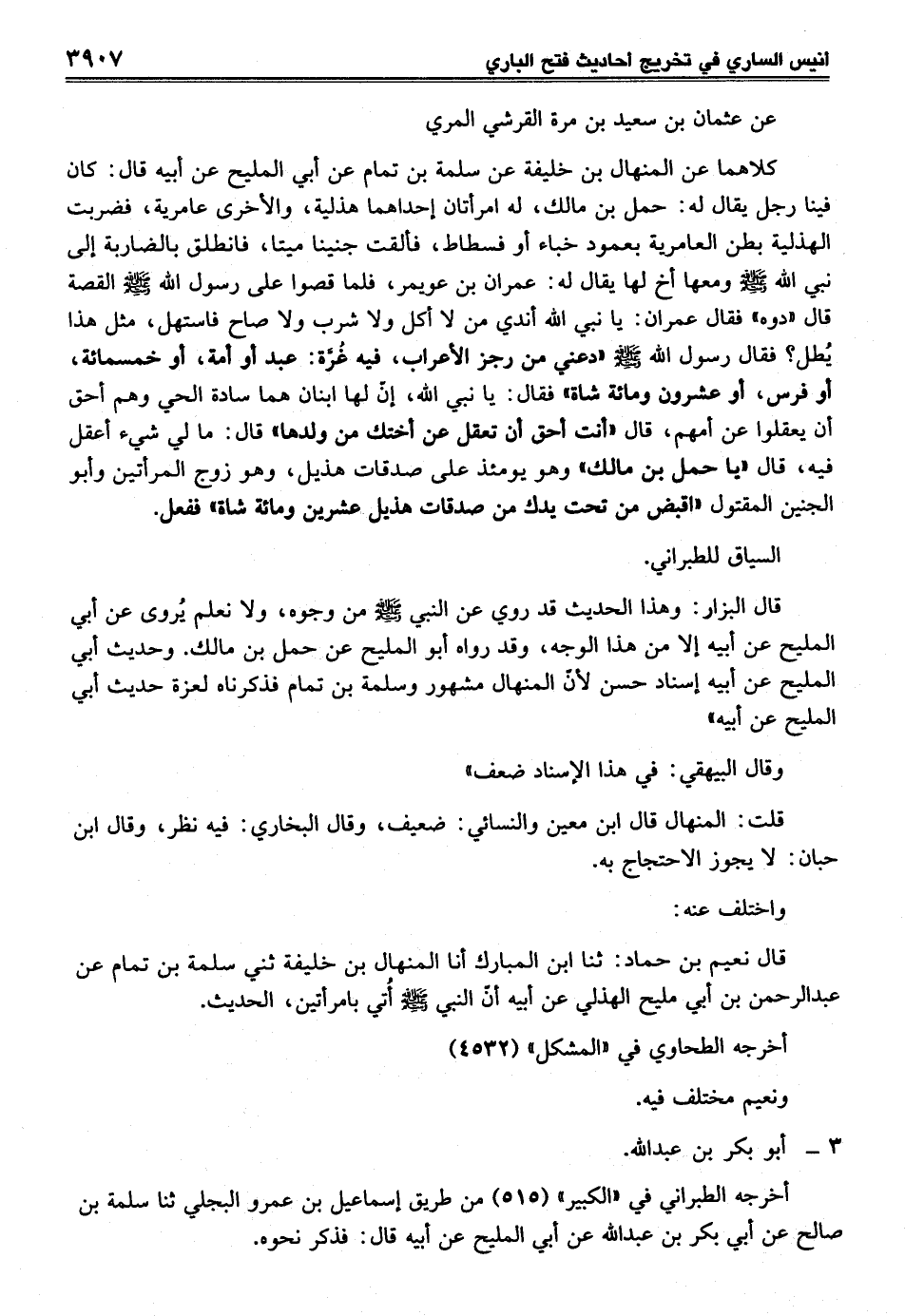 كلاهما عن المنهال بن خليفة عن سلمة بن تمام عن أبي المليح عن أبيه قال: كان فينا رجل يقال له: حمل بن مالك، له امرأتان إحداهما هذلية، والأخرى عامرية، فضربت الهذلية بطن العامرية بعمود خباء أو فسطاط، فألقت جنينا ميتا، فانطلق بالضاربة إلى نبي الله - صلى الله عليه وسلم - ومعها أخ لها يقال له: عمران بن عويمر، فلما قصوا على رسول الله - صلى الله عليه وسلم - القصة قال "دوه" فقال عمران: يا نبي الله أندي من لا أكل ولا شرب ولا صاح فاستهل، مثل هذا يُطل؟ فقال رسول الله - صلى الله عليه وسلم - "دعني من رجز الأعراب، فيه غُرَّة: عبد أو أمة، أو خمسمائة، أو فرس، أو عشرون ومائة شاة" فقال: يا نبي الله، إن لها ابنان هما سادة الحي وهم أحق أن يعقلوا عن أمهم، قال "أنت أحق أن تعقل عن أختك من ولدها" قال: ما لي شيء أعقل فيه، قال "يا حمل بن مالك" وهو يومئذ على صدقات هذيل، وهو زوج المرأتين وأبو الجنين المقتول "اقبض من تحت يدك من صدقات هذيل عشرين ومائة شاة" ففعل.