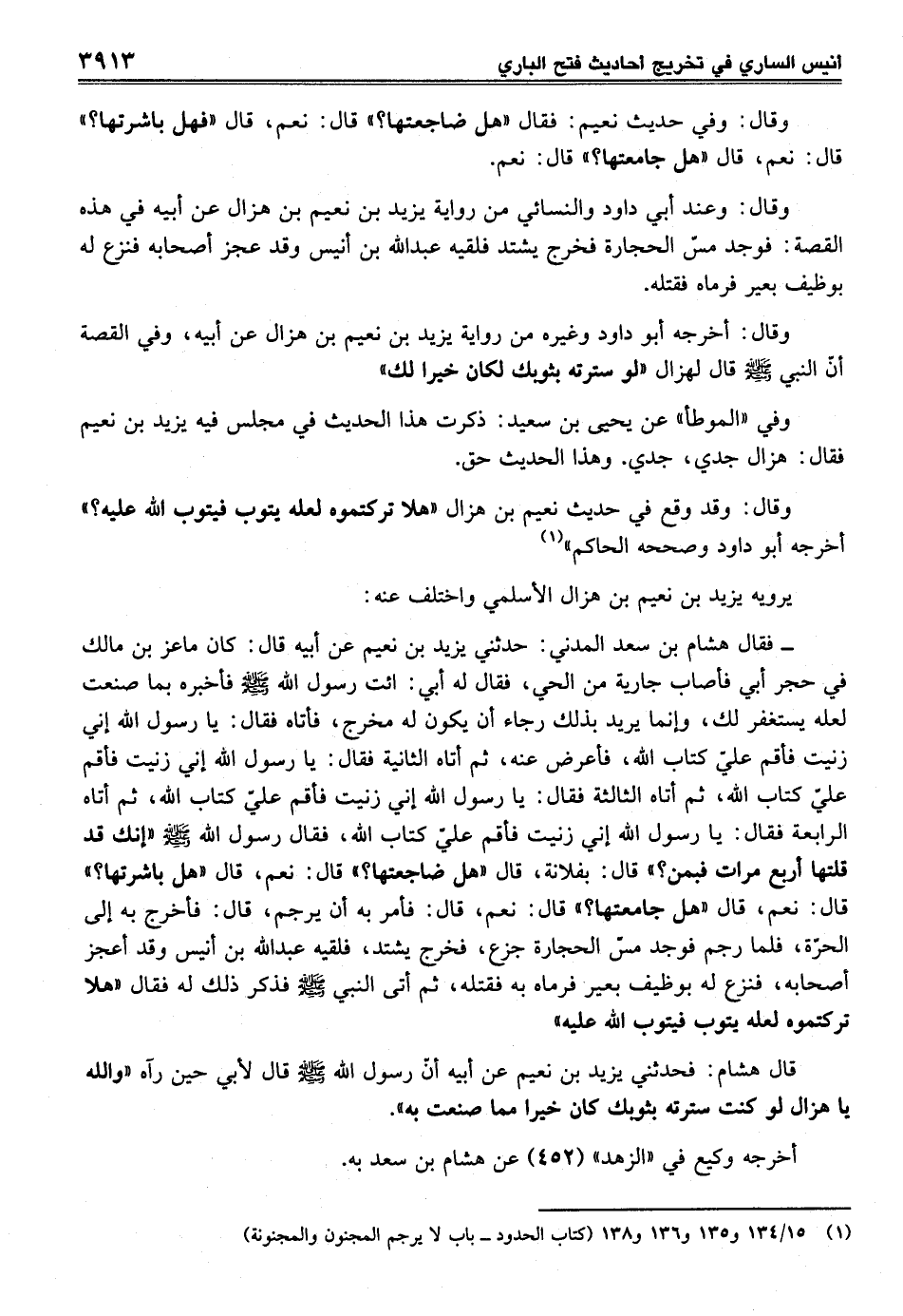 وقال: أخرجه أبو داود وغيره من رواية يزيد بن نعيم بن هزال عن أبيه، وفي القصة أنّ النبي صلى الله عليه وسلم قال لهزال "لو سترته بثوبك لكان خيرا لك"