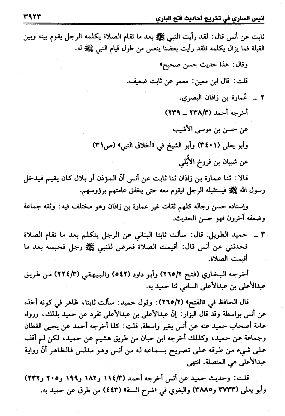 قال الحافظ في "الفتح" (2/ 265): وقول حميد: سألت ثابتا، ظاهر في كونه أخذه عن أنس بواسطة وقد قال البزار: إنّ عبد الأعلي بن عبد الأعلى تفرد عن حميد بذلك، ورواه عامة أصحاب حميد عنه عن أنس بغير واسطة. قلت: كذا أخرجه أحمد عن يحيى القطان وجماعة عن حميد، وكذلك أخرجه ابن حبان من طريق هشيم عن حميد، لكن لم أقف على شيء من طرقه على تصريح بسماعه له من أنس وهو مدلس فالظاهر أنّ رواية عبد الأعلى هي المتصلة. انتهى