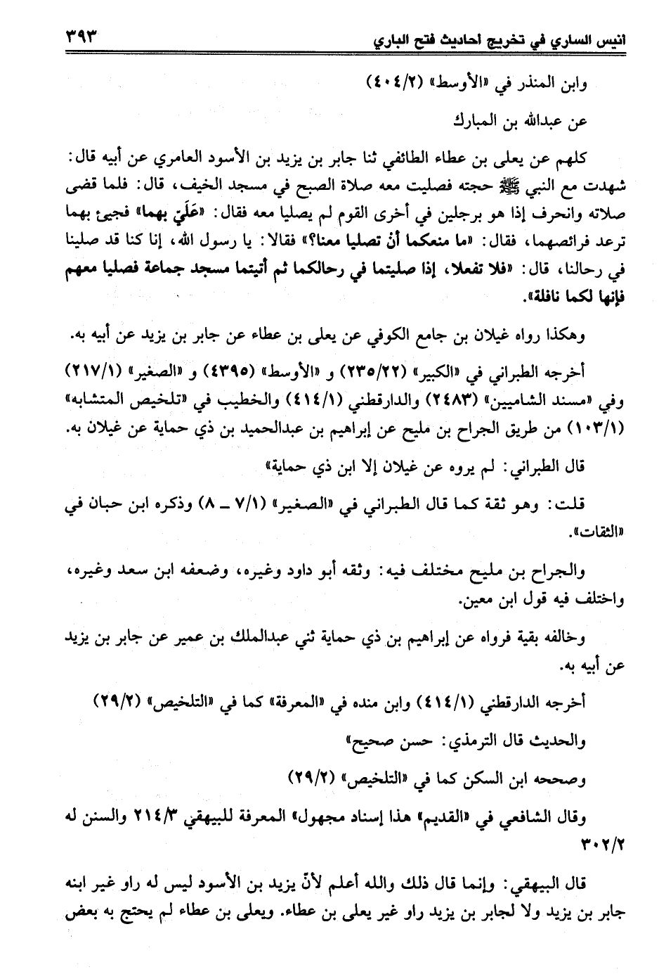 كلهم عن يعلي بن عطاء الطائفي ثنا جابر بن يزيد بن الأسود العامري عن أبيه قال: شهدت مع النبي - صلى الله عليه وسلم - حجته فصليت معه صلاة الصبح في مسجد الخيف، قال: فلما قضى صلاته وانحرف إذا هو برجلين في أخرى القوم لم يصليا معه فقال: "عَلَيّ بهما" فجيئ بهما ترعد فرائصهما، فقال: "ما منعكما أنْ تصليا معنا؟ " فقالا: يا رسول الله، إنا كنا قد صلينا في رحالنا، قال: "فلا تفعلا، إذا صليتما في رحالكما ثم أتيتما مسجد جماعة فصليا معهم فإنها لكما نافلة".