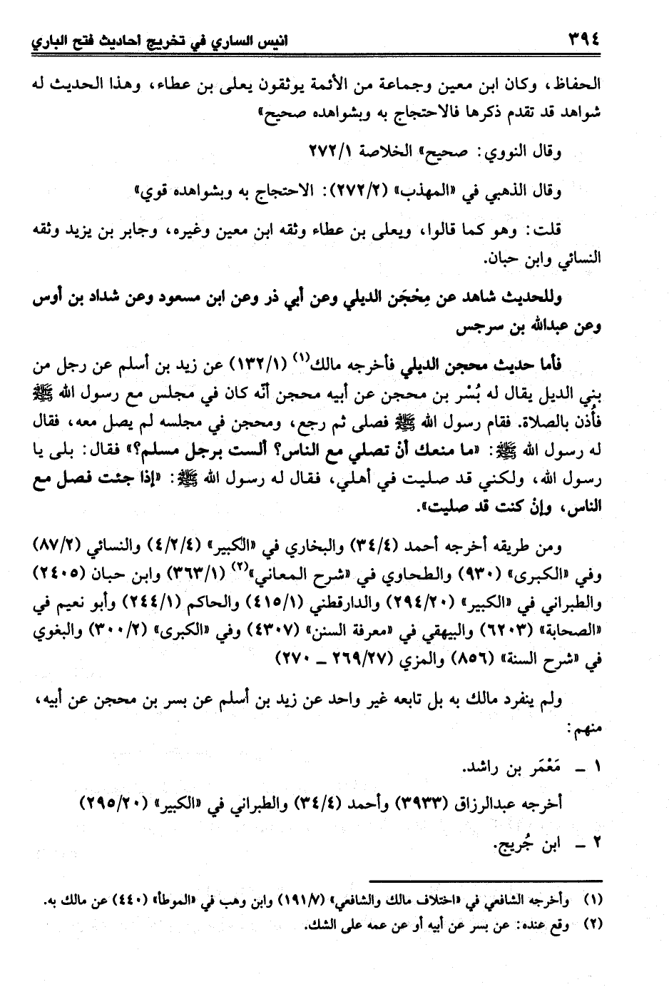 فأما حديث محجن الدبلي فأخرجه مالك (¬1) (1/ 132) عن زيد بن أسلم عن رجل من بني الديل يقال له بُسْر بن محجن عن أبيه محجن أنّه كان في مجلس مع رسول الله - صلى الله عليه وسلم - فأُذن بالصلاة. فقام رسول الله - صلى الله عليه وسلم - فصلى ثم رجع، ومحجن في مجلسه لم يصل معه، فقال له رسول الله - صلى الله عليه وسلم -: "ما منعك أنْ تصلي مع الناس؟ ألست برجل مسلم؟ " فقال: بلى يا رسول الله، ولكني قد صليت في أهلي، فقال له رسول الله - صلى الله عليه وسلم -: "إذا جئت فصل مع الناس، وإنْ كنت قد صليت".