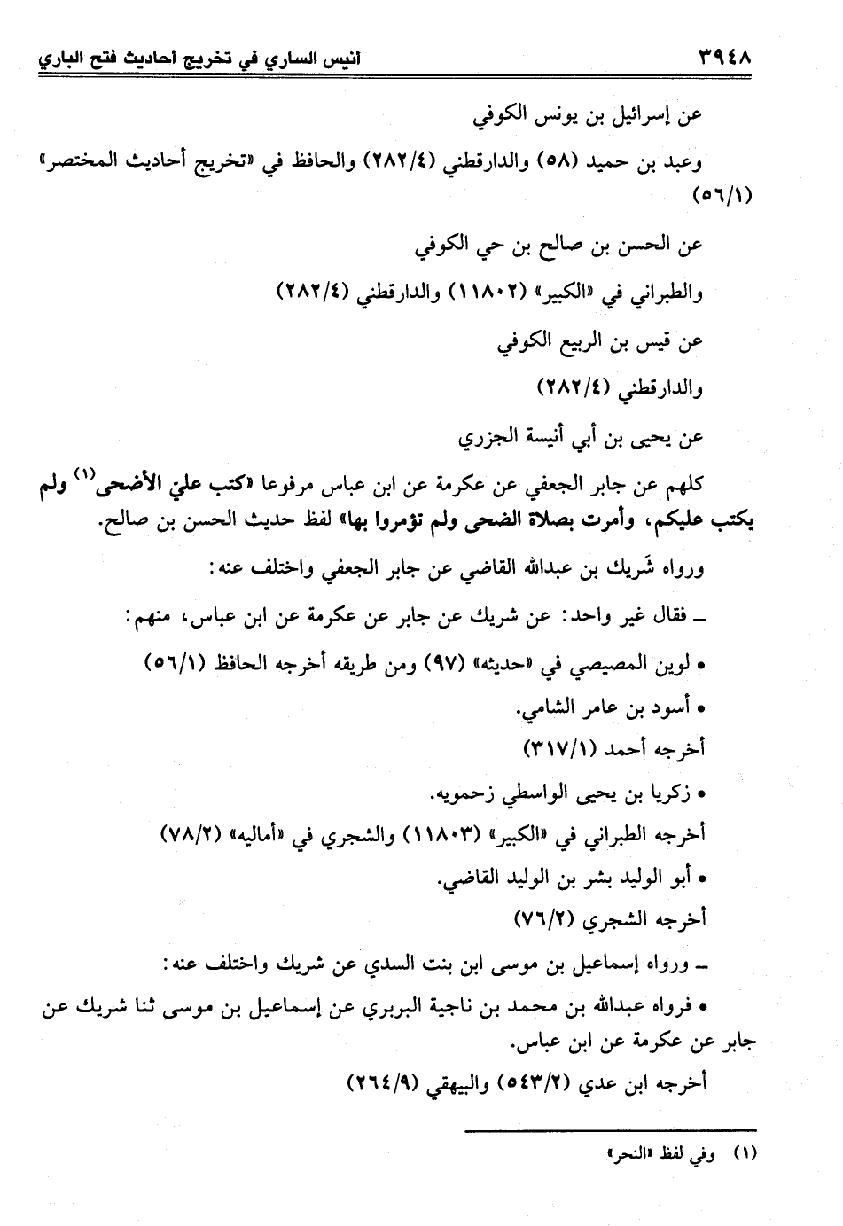 كلهم عن جابر الجعفي عن عكرمة عن ابن عباس مرفوعا "كتب عليّ الأضحى (¬1) ولم يكتب عليكم، وأمرت بصلاة الضحى ولم تؤمروا بها" لفظ حديث الحسن بن صالح.