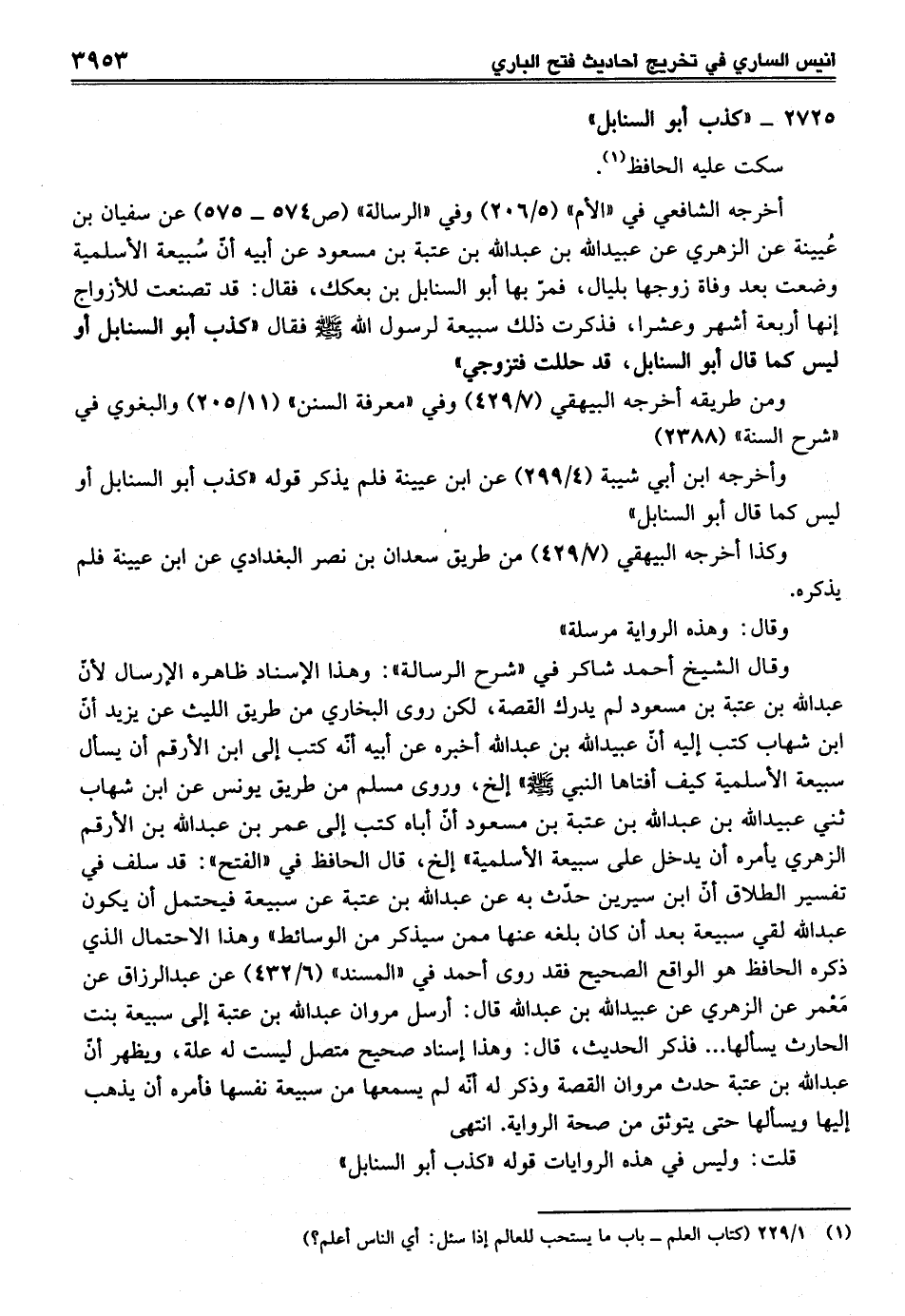 وقال الشيخ أحمد شاكر في "شرح الرسالة": وهذا الإسناد ظاهره الإرسال لأنّ عبد الله بن عتبة بن مسعود لم يدرك القصة، لكن روى البخاري من طريق الليث عن يزيد أنّ ابن شهاب كتب إليه أنّ عبيد الله بن عبد الله أخبره عن أبيه أنّه كتب إلى ابن الأرقم أن يسأل سبيعة الأسلمية كيف أفتاها النبي - صلى الله عليه وسلم -" إلخ، وروى مسلم من طريق يونس عن ابن شهاب ثني عبيد الله بن عبد الله بن عتبة بن مسعود أنّ أباه كتب إلى عمر بن عبد الله بن الأرقم الزهري يأمره أن يدخل على سبيعة الأسلمية" إلخ، قال الحافظ في "الفتح": قد سلف في تفسير الطلاق أنّ ابن سيرين حدّث به عن عبد الله بن عتبة عن سبيعة فيحتمل أن يكون عبد الله لقي سبيعة بعد أن كان بلغه عنها ممن سيذكر من الوسائط" وهذا الاحتمال الذي ذكره الحافظ هو الواقع الصحيح فقد روى أحمد في "المسند" (6/ 432) عن عبد الرزاق عن مَعْمر عن الزهري عن عبيد الله بن عبد الله قال: أرسل مروان عبد الله بن عتبة إلى سبيعة بنت الحارث يسألها ... فذكر الحديث، قال: وهذا إسناد صحيح متصل ليست له علة، ويظهر أنّ عبد الله بن عتبة حدث مروان القصة وذكر له أنّه لم يسمعها من سبيعة نفسها فأمره أن يذهب إليها ويسألها حتى يتوثق من صحة الرواية. انتهى