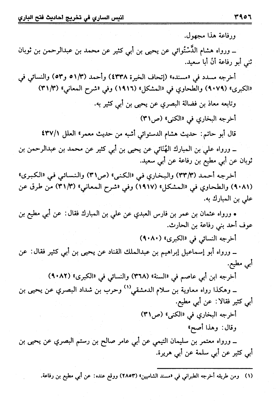 - ورواه هشام الدَّسْتُوائي عن يحيى بن أبي كثير عن محمد بن عبد الرحمن بن ثوبان ثني أبو رفاعة أنّ أبا سعيد.