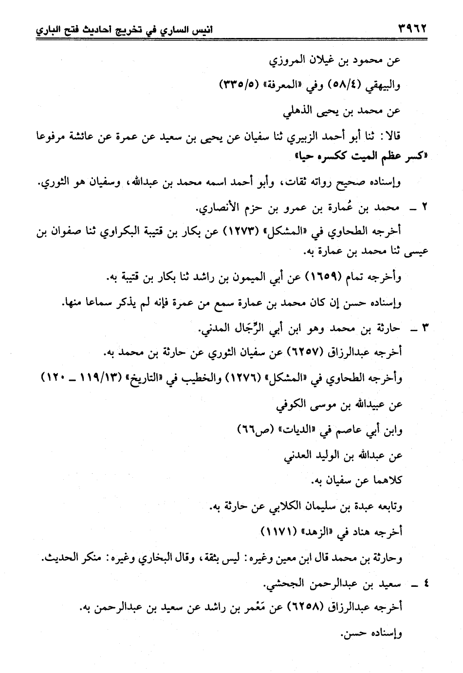 قالا: ثنا أبو أحمد الزبيري ثنا سفيان عن يحيى بن سعيد عن عمرة عن عائشة مرفوعاً "كسر عظم الميت ككسره حيا"