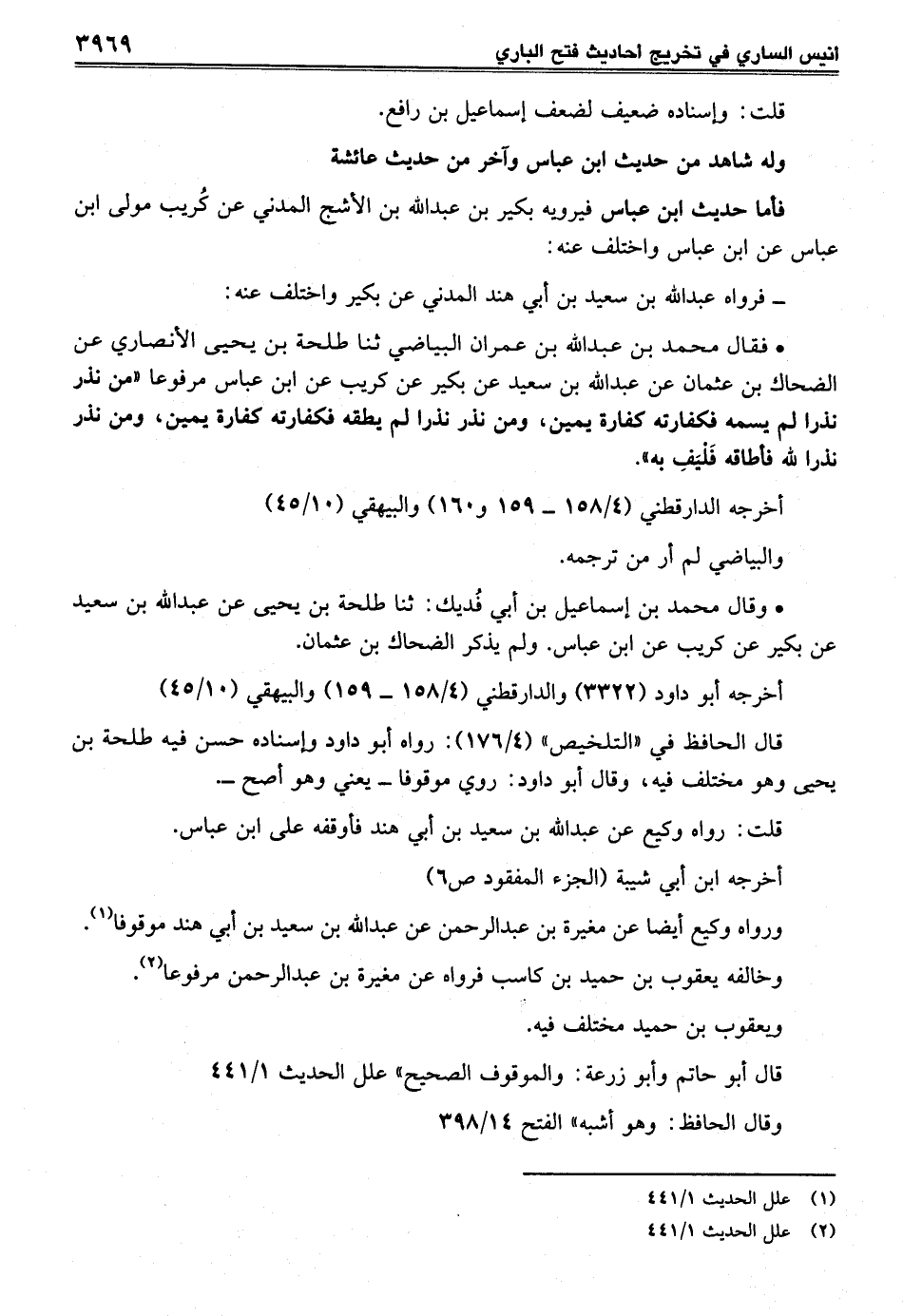• فقال محمد بن عبد الله بن عمران البياضي ثنا طلحة بن يحيى الأنصاري عن الضحاك بن عثمان عن عبد الله بن سعيد عن بكير عن كريب عن ابن عباس مرفوعاً "من نذر نذرا لم يسمه فكفارته كفارة يمين، ومن نذر نذرا لم يطقه فكفارته كفارة يمين، ومن نذر نذرا لله فأطاقه فَلْيَفِ به".