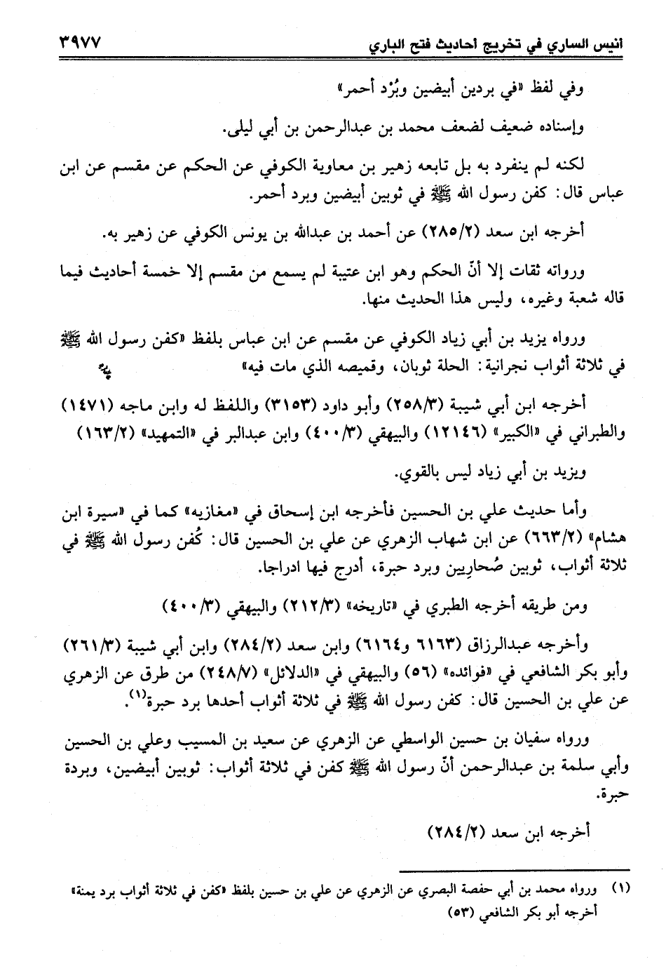 وأخرجه عبد الرزاق (6163 و 6164) وابن سعد (2/ 284) وابن أبي شيبة (3/ 261) وأبو بكر الشافعي في "فوائده" (56) والبيهقي في "الدلائل" (7/ 248) من طرق عن الزهري عن علي بن الحسين قال: كفن رسول الله صلى الله عليه وسلم في ثلاثة أثواب أحدها برد حبرة (¬1).