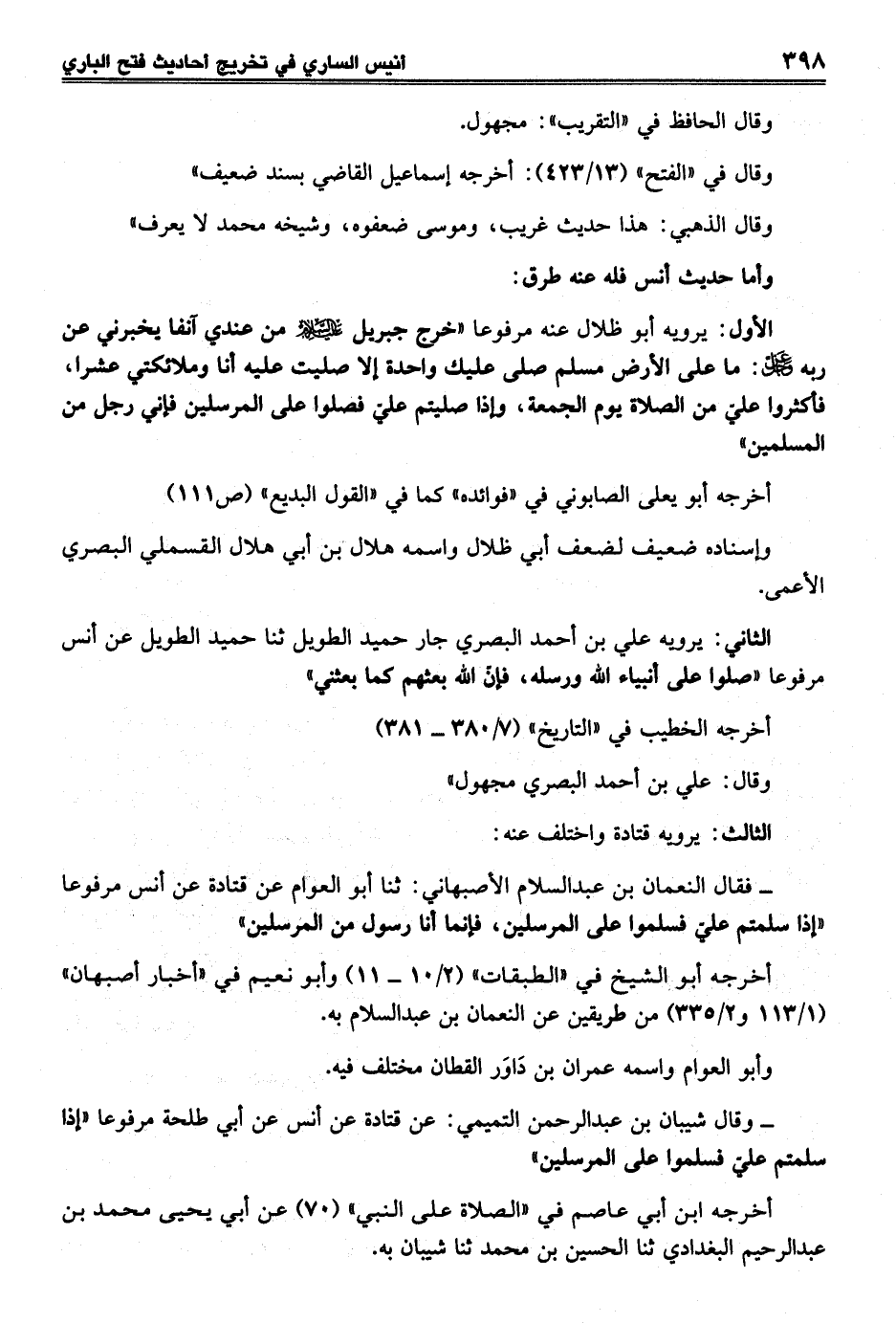 - فقال النعمان بن عبد السلام الأصبهاني: ثنا أبو العوام عن قتادة عن أنس مرفوعا "إذا سلمتم عليّ فسلموا على المرسلين، فإنما أنا رسول من المرسلين"