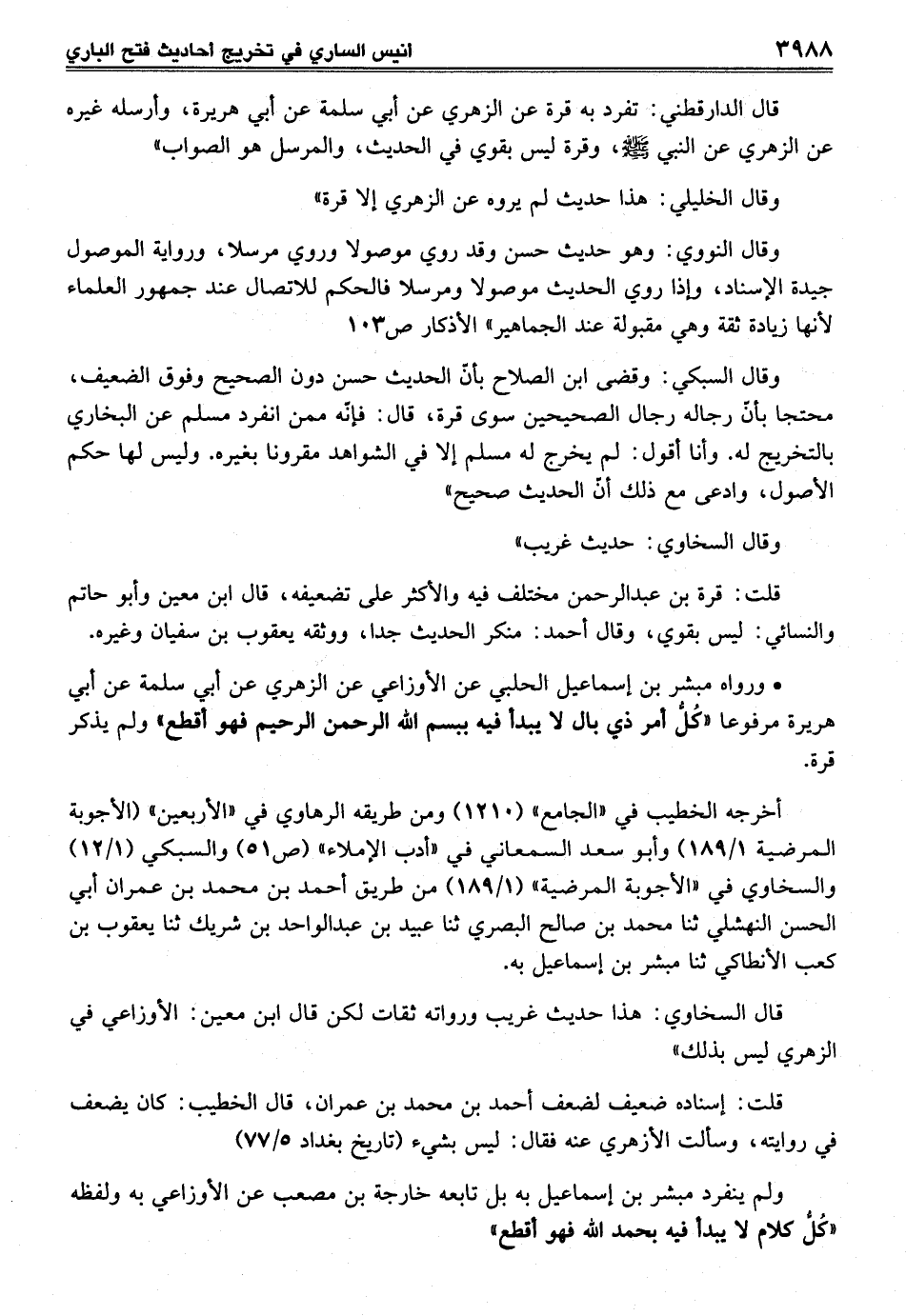 • ورواه مبشر بن إسماعيل الحلبي عن الأوزاعي عن الزهري عن أبي سلمة عن أبي هريرة مرفوعاً "كُلُّ أمر ذي بال لا يبدأ فيه ببسم الله الرحمن الرحيم فهو أقطع" ولم يذكر قرة.