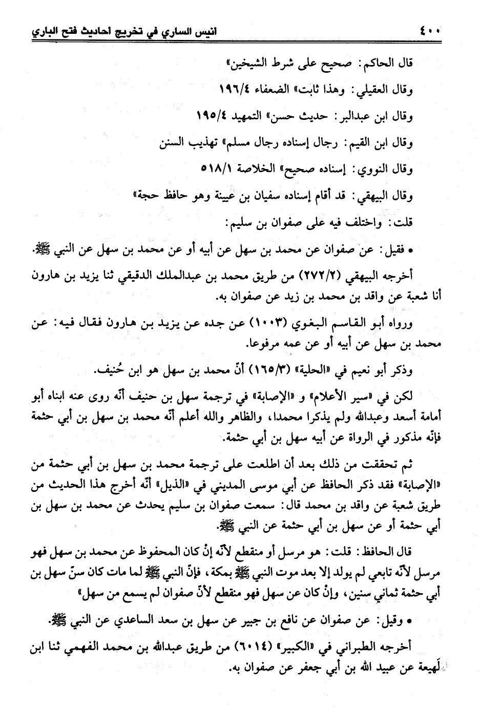 ثم تحققت من ذلك بعد أن اطلعت على ترجمة محمَّد بن سهل بن أبي حثمة من "الإصابة" فقد ذكر الحافظ عن أبي موسى المديني في "الذيل" أنّه أخرج هذا الحديث من طريق شعبة عن واقد بن محمَّد قال: سمعت صفوان بن سليم يحدث عن محمَّد بن سهل بن أبي حثمة أو عن سهل بن أبي حثمة عن النبي - صلى الله عليه وسلم -.