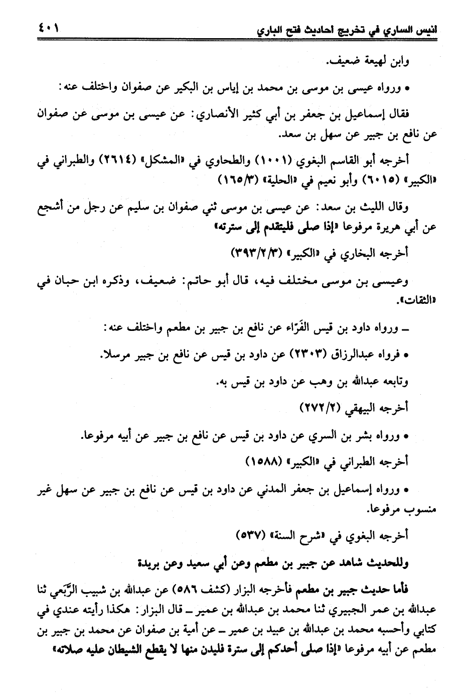 فأما حديث جبير بن مطعم فأخرجه البزار (كشف 586) عن عبد الله بن شبيب الرَّبَعي ثنا عبد الله بن عمر الجبيري ثنا محمَّد بن عبد الله بن عمير - قال البزار: هكذا رأيته عندي في كتابي وأحسبه محمَّد بن عبد الله بن عبيد بن عمير - عن أمية بن صفوان عن محمَّد بن جبير بن مطعم عن أبيه مرفوعا "إذا صلي أحدكم إلى سترة فليدن منها لا يقطع الشيطان عليه صلاته"