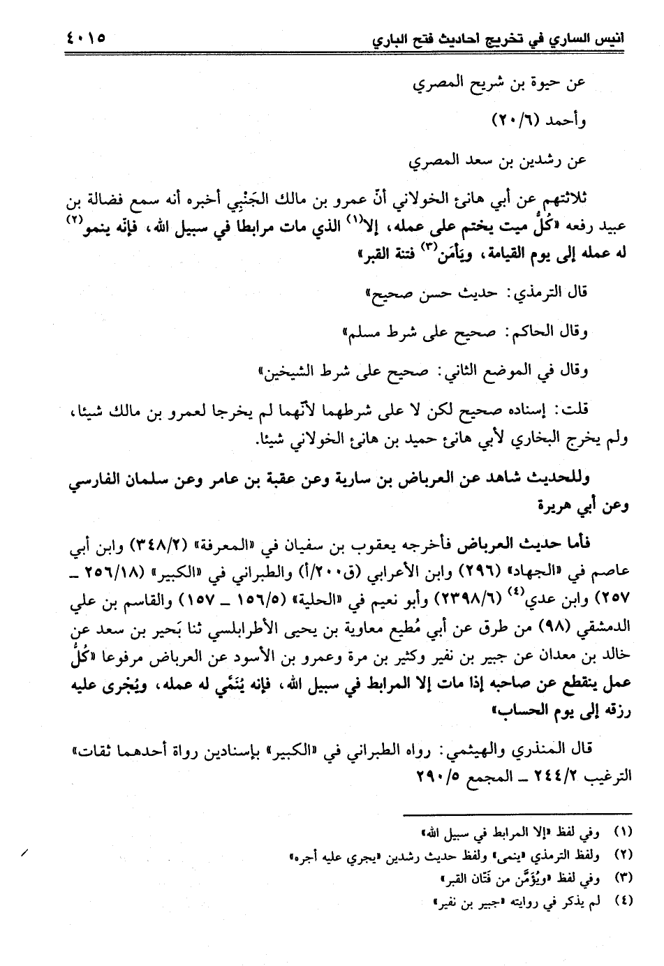 ثلاثتهم عن أبي هانئ الخولاني أنّ عمرو بن مالك الجَنْبِي أخبره أنه سمع فضالة بن عبيد رفعه "كُلُّ ميت يختم على عمله، إلا (¬1) الذي مات مرابطا في سبيل الله، فإنّه ينمو (¬2) له عمله إلى يوم القيامة، ويَأمَن (¬3) فتنة القبر"