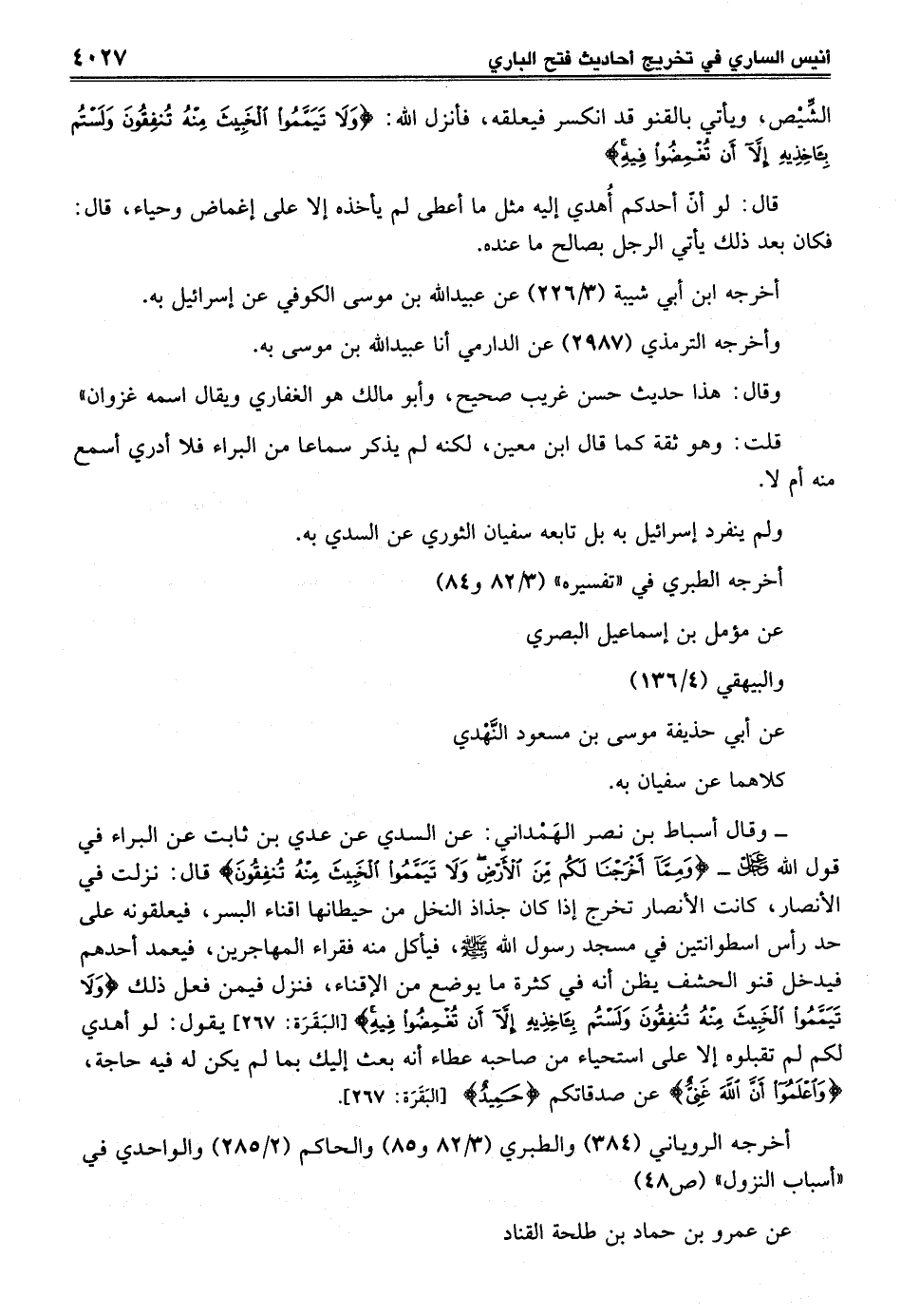 - وقال أسباط بن نصر الهَمْداني: عن السدي عن عدي بن ثابت عن البراء في قول الله عز وجل {وَمِمَّا أَخْرَجْنَا لَكُمْ مِنَ الْأَرْضِ وَلَا تَيَمَّمُوا الْخَبِيثَ مِنْهُ تُنْفِقُونَ} قال: نزلت في الأنصار، كانت الأنصار تخرج إذا كان جذاذ النخل من حيطانها اقناء البسر، فيعلقونه على حد رأس اسطوانتين في مسجد رسول الله - صلى الله عليه وسلم -، فيأكل منه فقراء المهاجرين، فيعمد أحدهم فيدخل قنو الحشف يظن أنه في كثرة ما يوضع من الإقناء، فنزل فيمن فعل ذلك {وَلَا تَيَمَّمُوا الْخَبِيثَ مِنْهُ تُنْفِقُونَ وَلَسْتُمْ بِآخِذِيهِ إِلَّا أَنْ تُغْمِضُوا فِيهِ} [البقرة: 267] يقول: لو أهدي لكم لم تقبلوه إلا على استحياء من صاحبه عطاء أنه بعث إليك بما لم يكن له فيه حاجة، {وَاعْلَمُوا أَنَّ اللَّهَ غَنِيٌّ} عن صدقاتكم {حَمِيدٌ} [البقرة: 267].