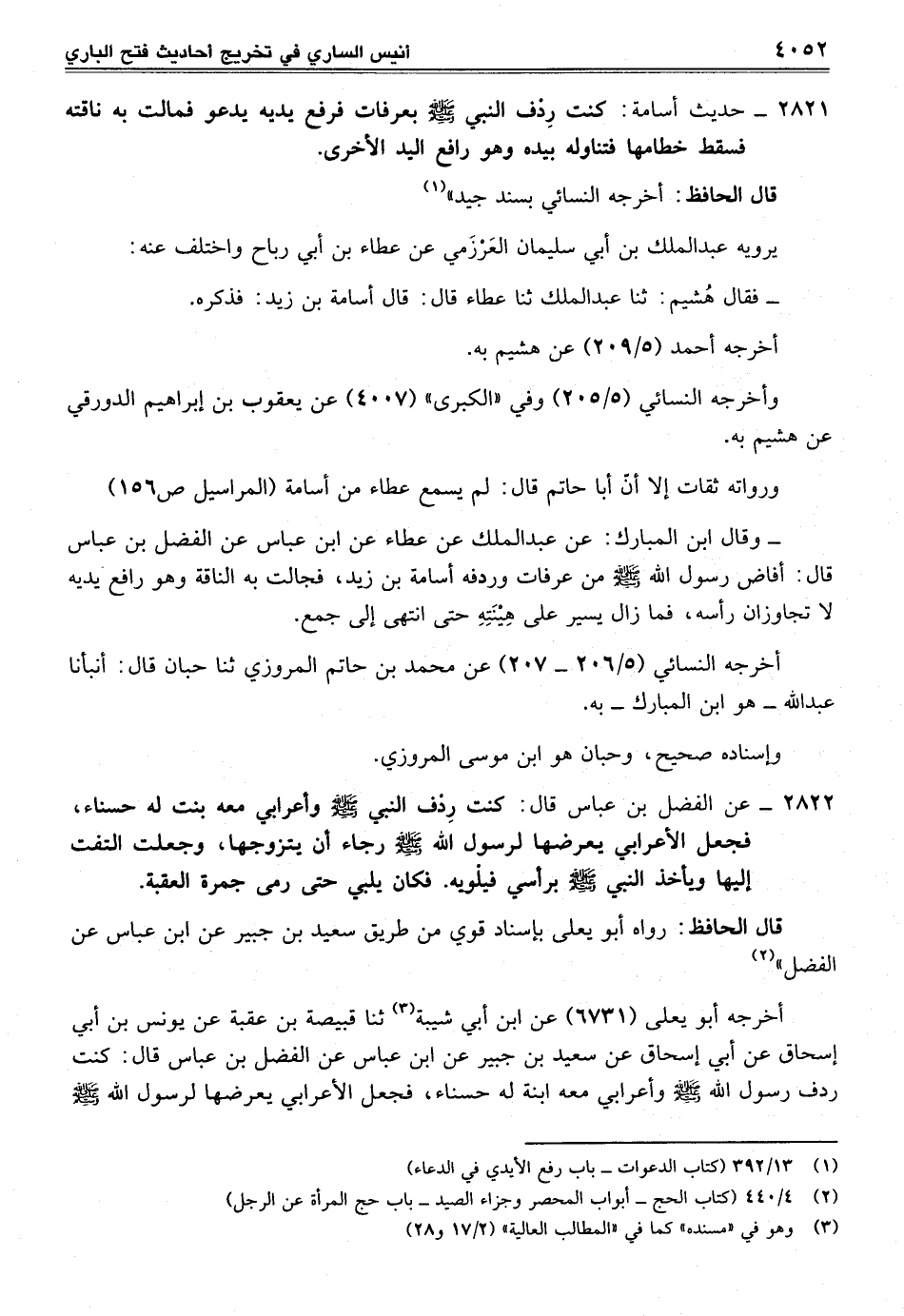 2822 - عن الفضل بن عباس قال: كنت رِدْف النبي - صلى الله عليه وسلم - وأعرابي معه بنت له حسناء، فجعل الأعرابي يعرضها لرسول الله - صلى الله عليه وسلم - رجاء أن يتزوجها، وجعلت التفت إليها ويأخذ النبي - صلى الله عليه وسلم برأسي فيلْويه. فكان يلبي حتى رمى جمرة العقبة.