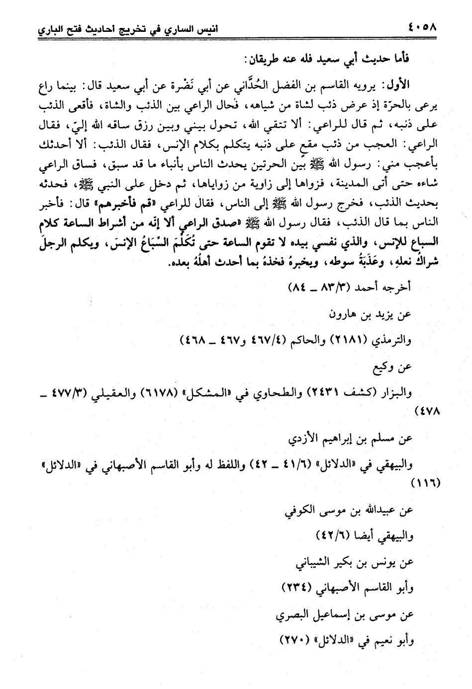 الأول: يرويه القاسم بن الفضل الحُدَّاني عن أبي نَضْرة عن أبي سعيد قال: بينما راع يرعى بالحرّة إذ عرض ذئب لشاة من شياهه، فُحال الراعي بين الذئب والشاة، فأقعى الذئب على ذنبه، ثم قال للراعي: ألا تتقي الله، تحول بيني وبين رزق ساقه الله إليّ، فقال الراعي: العجب من ذئب مقعٍ على ذنبه يتكلم بكلام الإنس، فقال الذئب: ألا أحدثك بأعجب مني: رسول الله - صلى الله عليه وسلم - بين الحرتين يحدث الناس بأنباء ما قد سبق، فساق الراعي شاءه حتى أتى المدينة، فزواها إلى زاوية من زواياها، ثم دخل على النبي - صلى الله عليه وسلم -، فحدثه بحديث الذئب، فخرج رسول الله - صلى الله عليه وسلم - إلى الناس، فقال للراعي "قم فأخبرهم" قال: فأخبر الناس بما قال الذئب، فقال رسول الله صلى الله عليه وسلم "صدق الراعي ألا إنّه من أشراط الساعة كلام السباع للإنس، والذي نفسي بيده لا تقوم الساعة حتى تُكَلمَ السِّبَاعُ الإنسَ، ويكلم الرجلَ شراكُ نعلهِ، وعَذَبَةُ سوطه، ويخبرهُ فخذهُ بما أحدث أهلُهُ بعده.