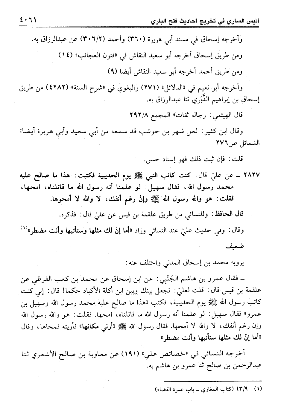 - فقال عمرو بن هاشم الجَنْبِي: عن ابن إسحاق عن محمد بن كعب القرظي عن علقمة بن قيس قال: قلت لعليّ: تجعل بينك وبين ابن أكلة الأكباد حكماً! قال: إني كنت كاتب رسول الله صلى الله عليه وسلم يوم الحديبية، فكتب "هذا ما صالح عليه محمد رسول الله وسهيل بن عمرو" فقال سهيل: لو علمنا أنه رسول الله ما قاتلناه، امحها. فقلت: هو والله رسول الله وإن رغم أنفك، لا والله لا أمحها. فقال رسول الله - صلى الله عليه وسلم - "أرني مكانها" فأريته فمحاها، وقال "أما إنّ لك مثلها ستأتيها وأنت مضطر"