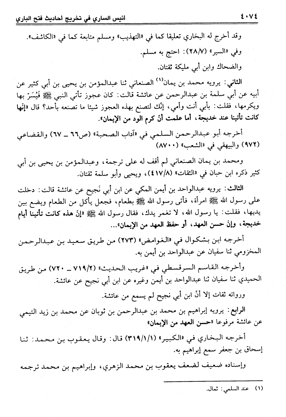 الثالث: يرويه عبد الواحد بن أيمن المكي عن ابن أبي نَجيح عن عائشة قالت: دخلت على رسول الله - صلى الله عليه وسلم - امرأة، فأتى رسول الله - صلى الله عليه وسلم - بطعام، فجعل يأكل من الطعام ويضع بين يديها، فقلت: يا رسول الله، لا تغمر يدك، فقال رسول الله - صلى الله عليه وسلم - "إن هذه كانت تأتينا أيام خديجة، وإنّ حسن العهد، أو حفظ العهد من الإيمان" ...