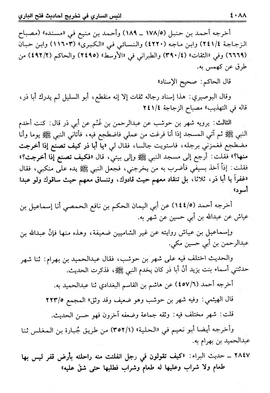 والحديث اختلف فيه على شهر بن حوشب، فقال عبد الحميد بن بهرام: ثنا شهر حدثتني أسماء بنت يزيد أنّ أبا ذر كان يخدم النبي - صلى الله عليه وسلم -، فذكرت الحديث.