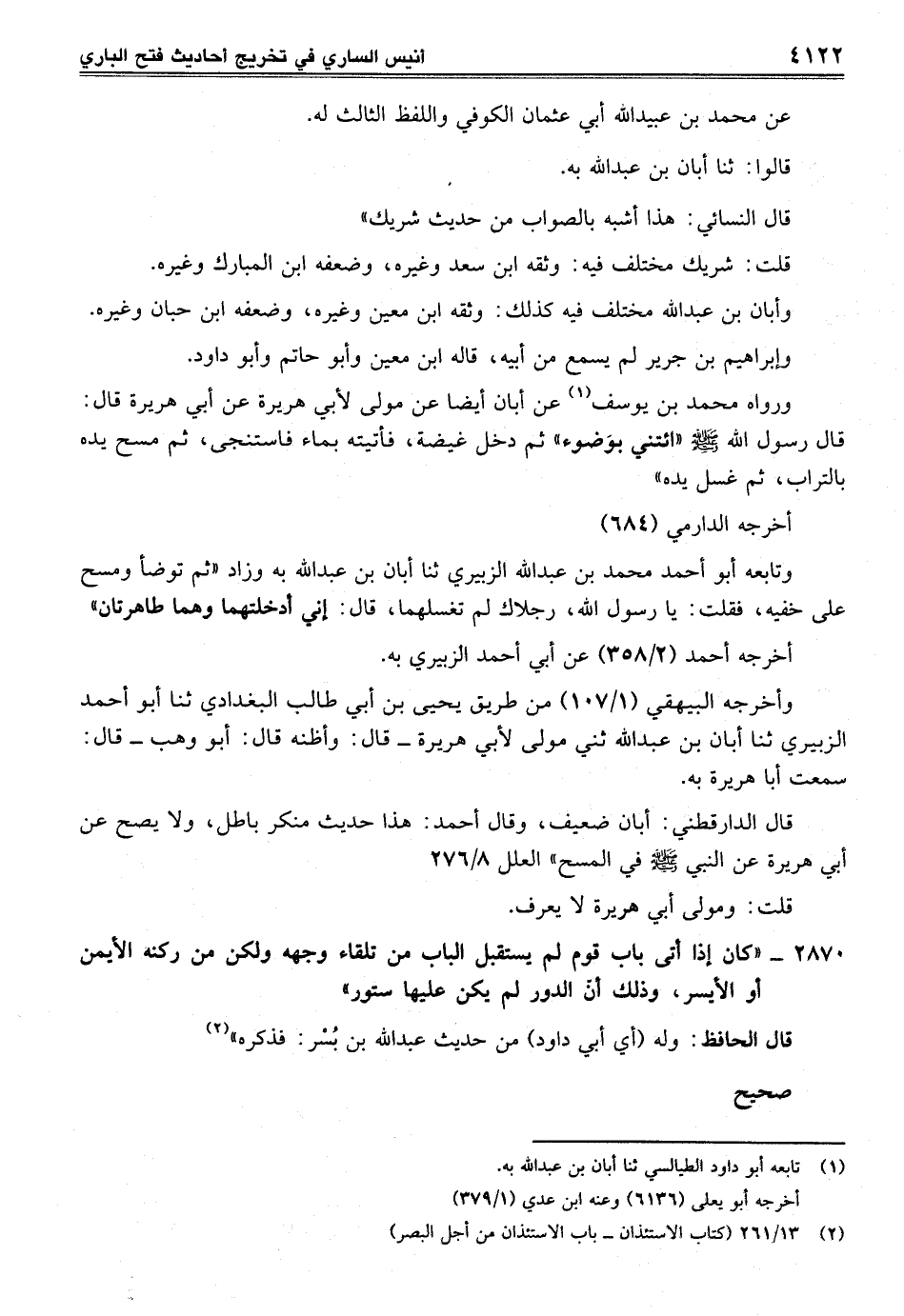 قال الدارقطني: أبان ضعيف، وقال أحمد: هذا حديث منكر باطل، ولا يصح عن أبي هريرة عن النبي -صلى الله عليه وسلم - في المسح" العلل 8/ 276