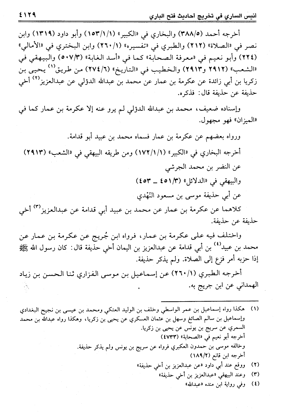 أخرجه أحمد (5/ 388) والبخاري في "الكبير" (1/ 1/ 153) وأبو داود (1319) وابن نصر في "الصلاة" (212) والطبري في "تفسيره" (1/ 260) وابن البختري في "الأمالي" (224) وأبو نعيم في "معرفة الصحابة" كما في "أسد الغابة" (3/ 507) والبيهقي في "الشعب" (2912 و 2913) والخطيب في "التاريخ" (6/ 274) من طريق (¬1) يحيى بن زكريا بن أبي زائدة عن عكرمة بن عمار عن محمد بن عبد الله الدؤلي عن عبد العزيز (¬2) أخي حذيفة عن حذيفة قال: فذكره.