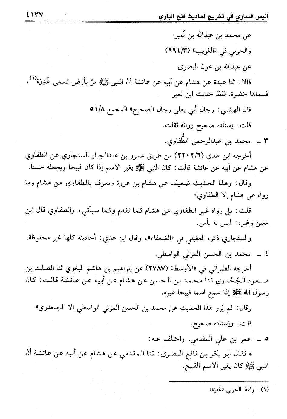 قالا: ثنا عبدة عن هشام عن أبيه عن عائشة أنّ النبي - صلى الله عليه وسلم - مرّ بأرض تسمى غَدِرَة (¬1)، فسماها خضرة. لفظ حديث ابن نمير