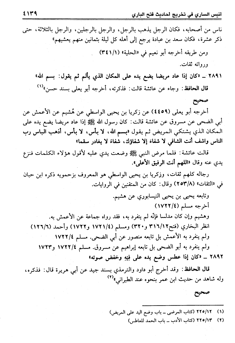 2891 - "كان إذا عاد مريضا يضع يده على المكان الذي يألم ثم يقول: بسم الله"