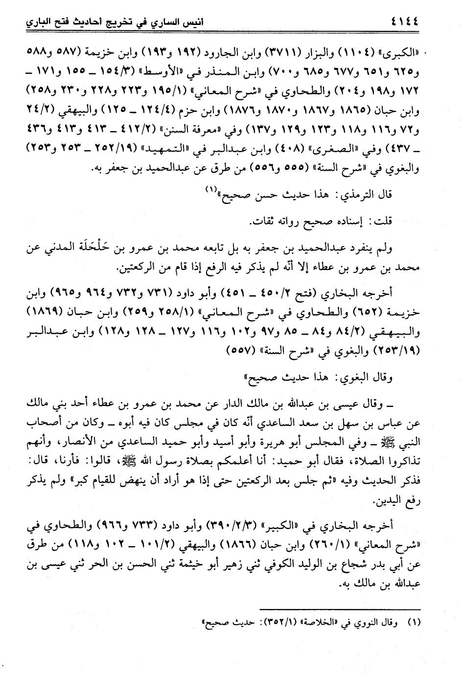"الكبرى" (1104) والبزار (3711) وابن الجارود (192 و 193) وابن خزيمة (587 و588 و625 و651 و 677 و 685 و 700) وابن المنذر في "الأوسط" (3/ 154 - 155 و 171 - 172 و198 و 204) والطحاوي في "شرح المعاني" (1/ 195 و 223 و 228 و 230 و 258) وابن حبان (1865 و 1867 و1870 و 1876) وابن حزم (4/ 124 - 125) والبيهقي (2/ 24 و 72 و 116 و 118 و 123 و 129 و 137) وفي "معرفة السنن" (2/ 412 - 413 و 413 و 436 - 437) وفي "الصغرى" (408) وابن عبد البر في "التمهيد" (19/ 252 - 253 و 253) والبغوي في "شرح السنة" (555 و 556) من طرق عن عبد الحميد بن جعفر به.