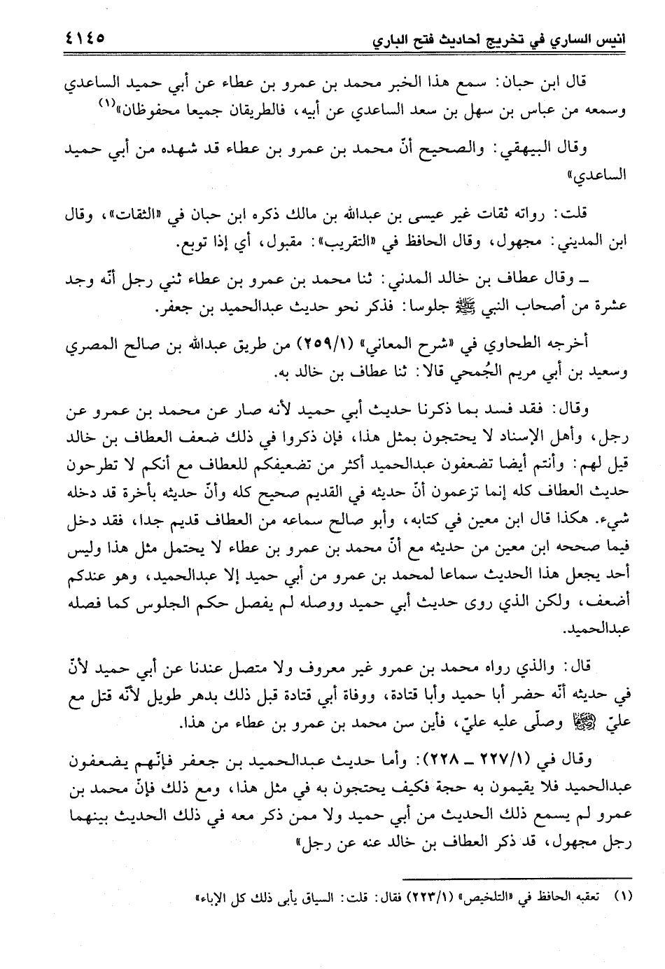 وقال في (1/ 227 - 228): وأما حديث عبد الحميد بن جعفر فإنّهم يضعفون عبد الحميد فلا يقيمون به حجة فكيف يحتجون به في مثل هذا، ومع ذلك فإنّ محمد بن عمرو لم يسمع ذلك الحديث من أبي حميد ولا ممن ذكر معه في ذلك الحديث بينهما رجل مجهول، قد ذكر العطاف بن خالد عنه عن رجل"