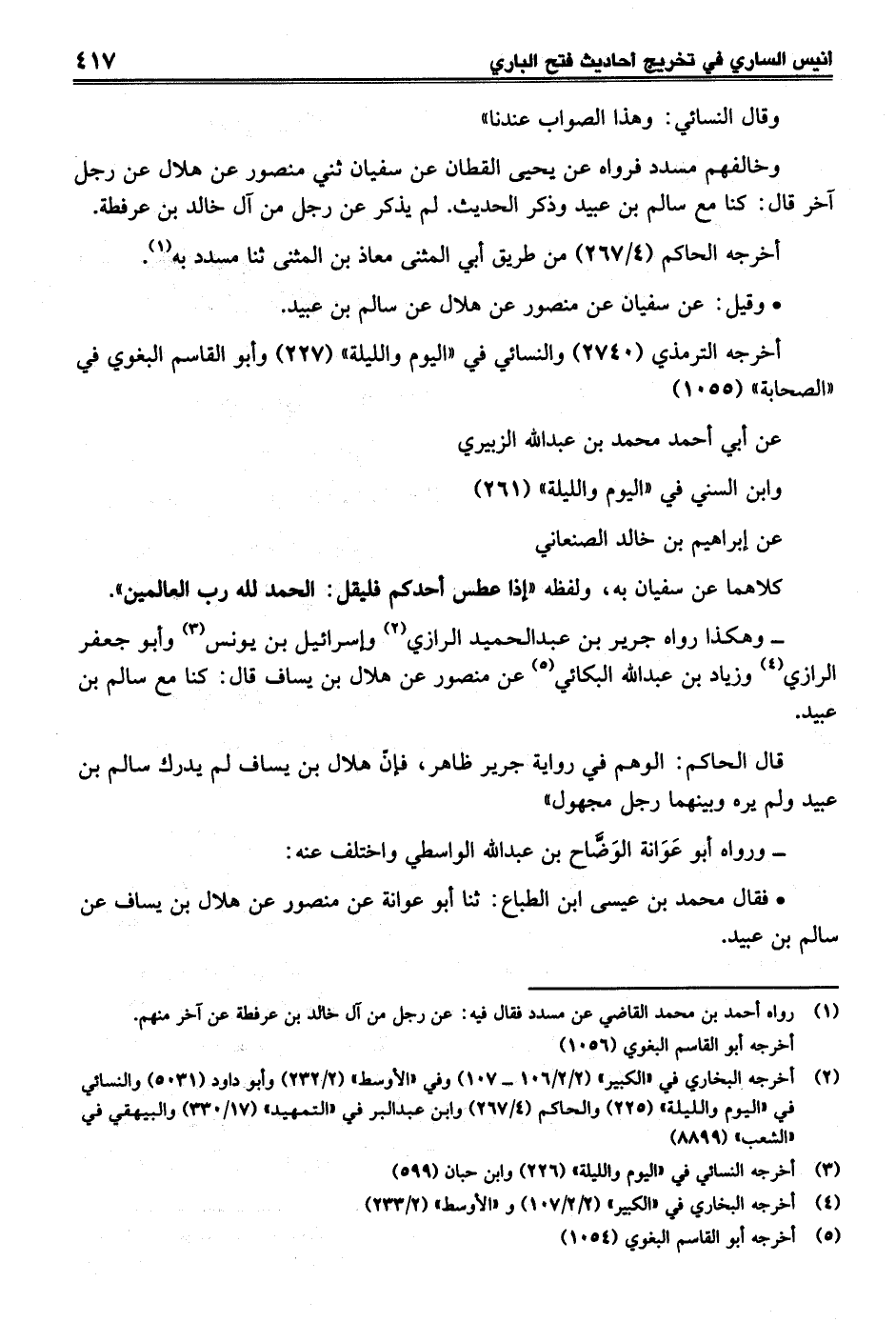 - وهكذا رواه جرير بن عبد الحميد الرازي (¬2) وإسرائيل بن يونس (¬3) وأبو جعفر الرازي (¬4) وزياد بن عبد الله البكائي (¬5) عن منصور عن هلال بن يساف قال: كنا مع سالم بن عبيد.