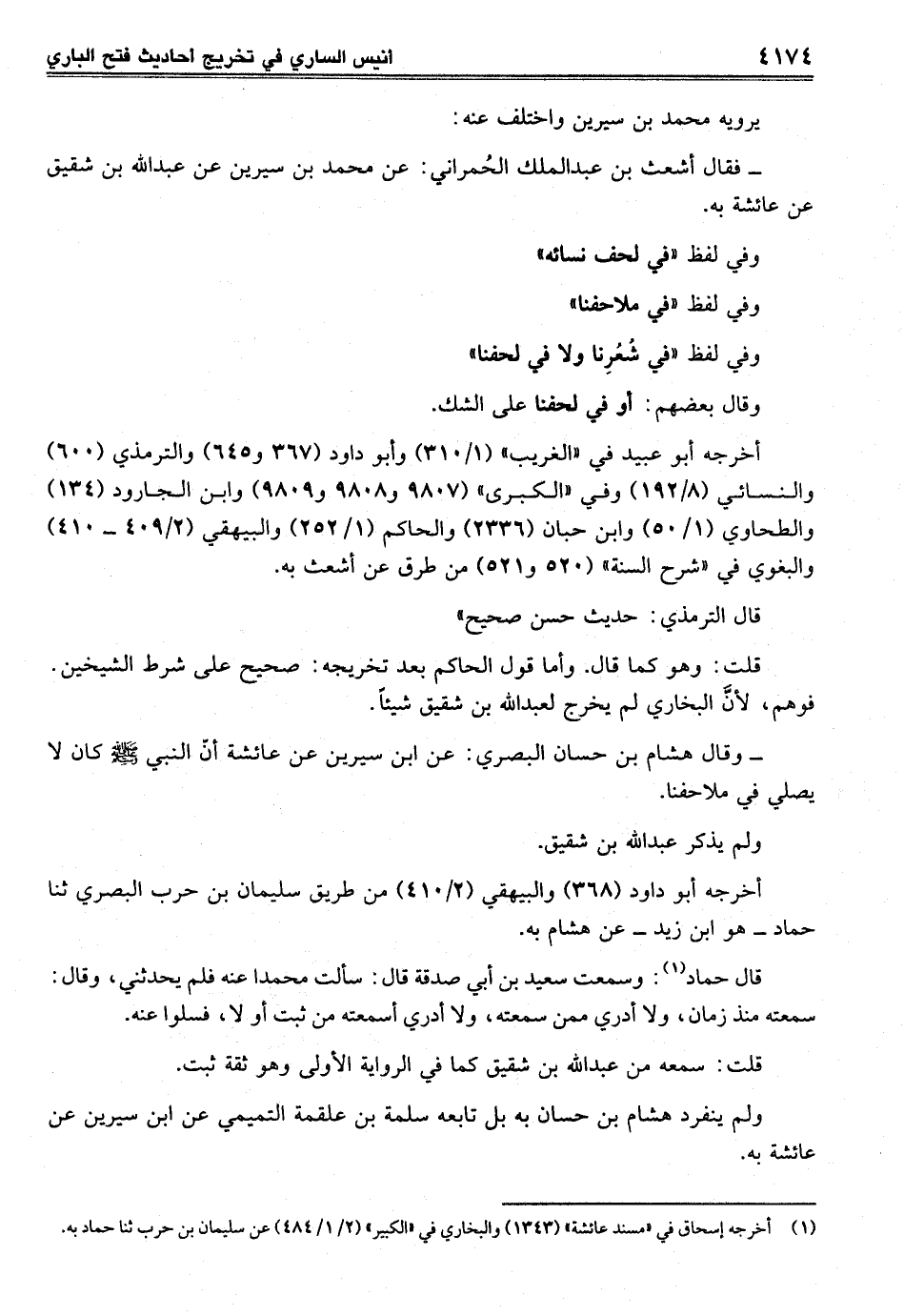 - وقال هشام بن حسان البصري: عن ابن سيرين عن عائشة أنّ النبي - صلى الله عليه وسلم - كان لا يصلي في ملاحفنا.