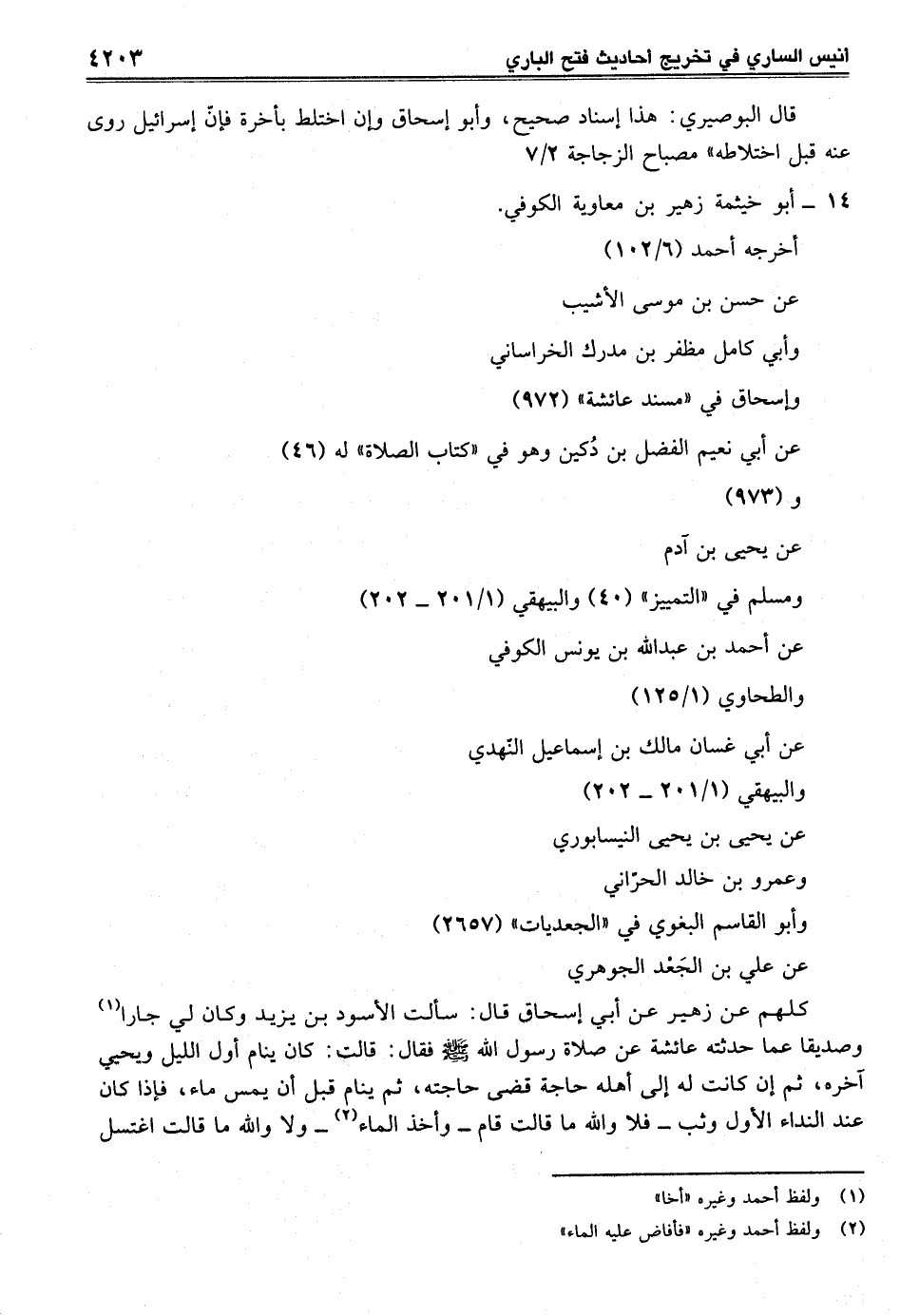 كلهم عن زهير عن أبي إسحاق قال: سألت الأسود بن يزيد وكان لي جارا (¬1) وصديقا عما حدثته عائشة عن صلاة رسول الله - صلى الله عليه وسلم - فقال: قالت: كان ينام أول الليل ويحيي آخره، ثم إن كانت له إلى أهله حاجة قضى حاجته، ثم ينام قبل أن يمس ماء، فإذا كان عند النداء الأول وثب- فلا والله ما قالت قام- وأخذ الماء (¬2) - ولا والله ما قالت اغتسل