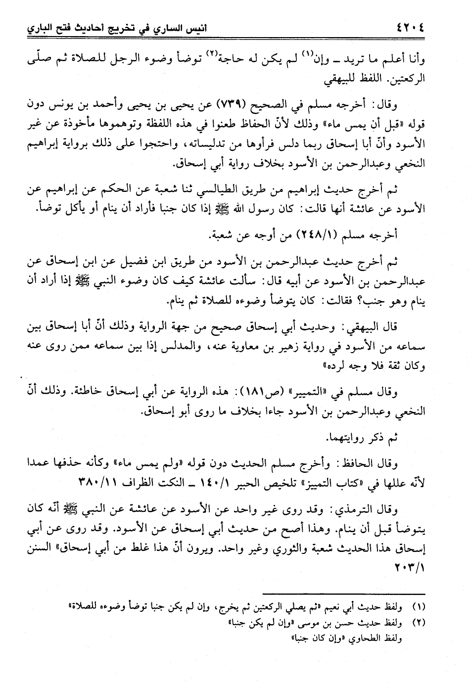 وقال: أخرجه مسلم في الصحيح (739) عن يحيى بن يحيى وأحمد بن يونس دون قوله "قبل أن يمس ماء" وذلك لأنّ الحفاظ طعنوا في هذه اللفظة وتوهموها مأخوذة عن غير الأسود وأنّ أبا إسحاق ربما دلس فرأوها من تدليساته، واحتجوا على ذلك برواية إبراهيم النخعي وعبد الرحمن بن الأسود بخلاف رواية أبي إسحاق.