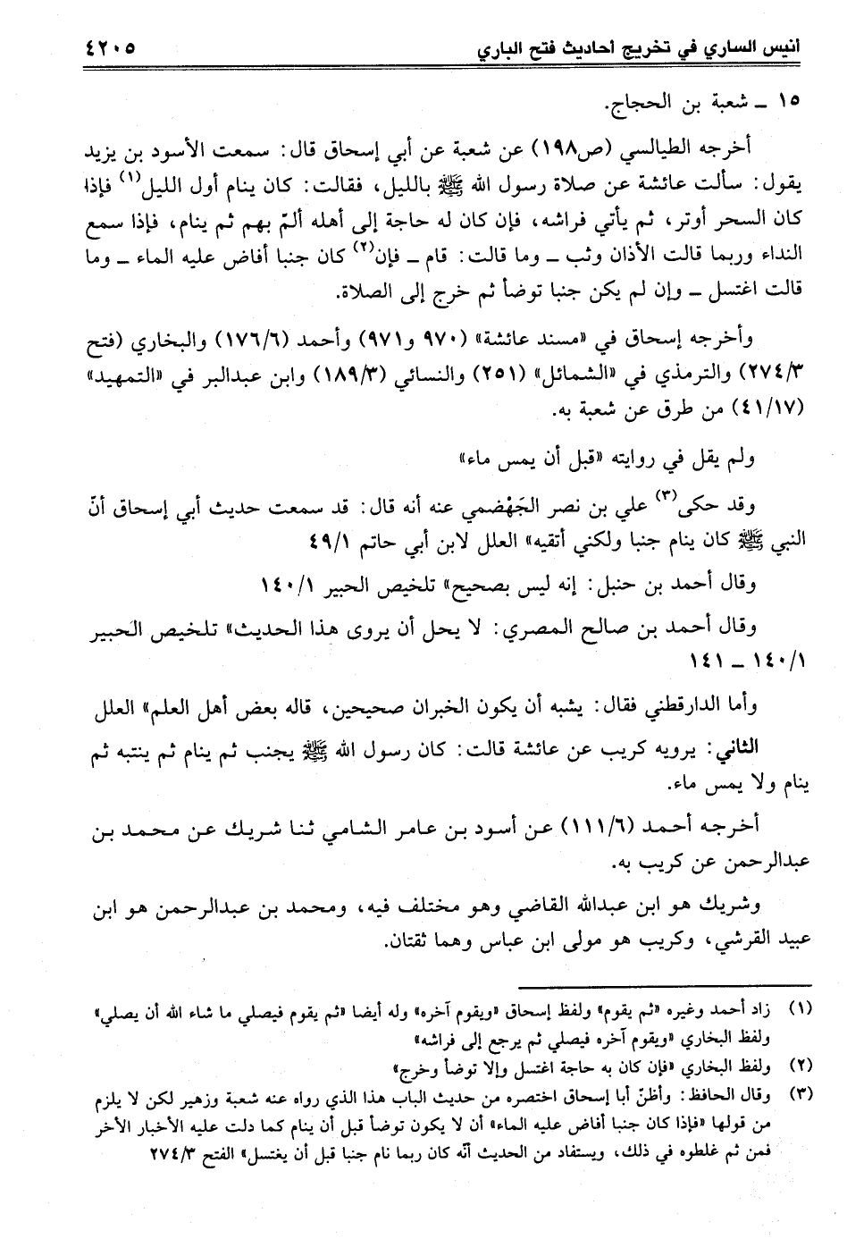 (¬3) وقال الحافظ: وأظنّ أبا إسحاق اختصره من حديث الباب هذا الذي رواه عنه شعبة وزهير لكن لا يلزم من قولها "فإذا كان جنبا أفاض عليه الماء" أن لا يكون توضأ قبل أن ينام كما دلت عليه الأخبار الآخر فمن ثم غلطوه في ذلك، ويستفاد من الحديث أنّه كان ربما نام جنبا قبل أن يغتسل" الفتح 3/ 274