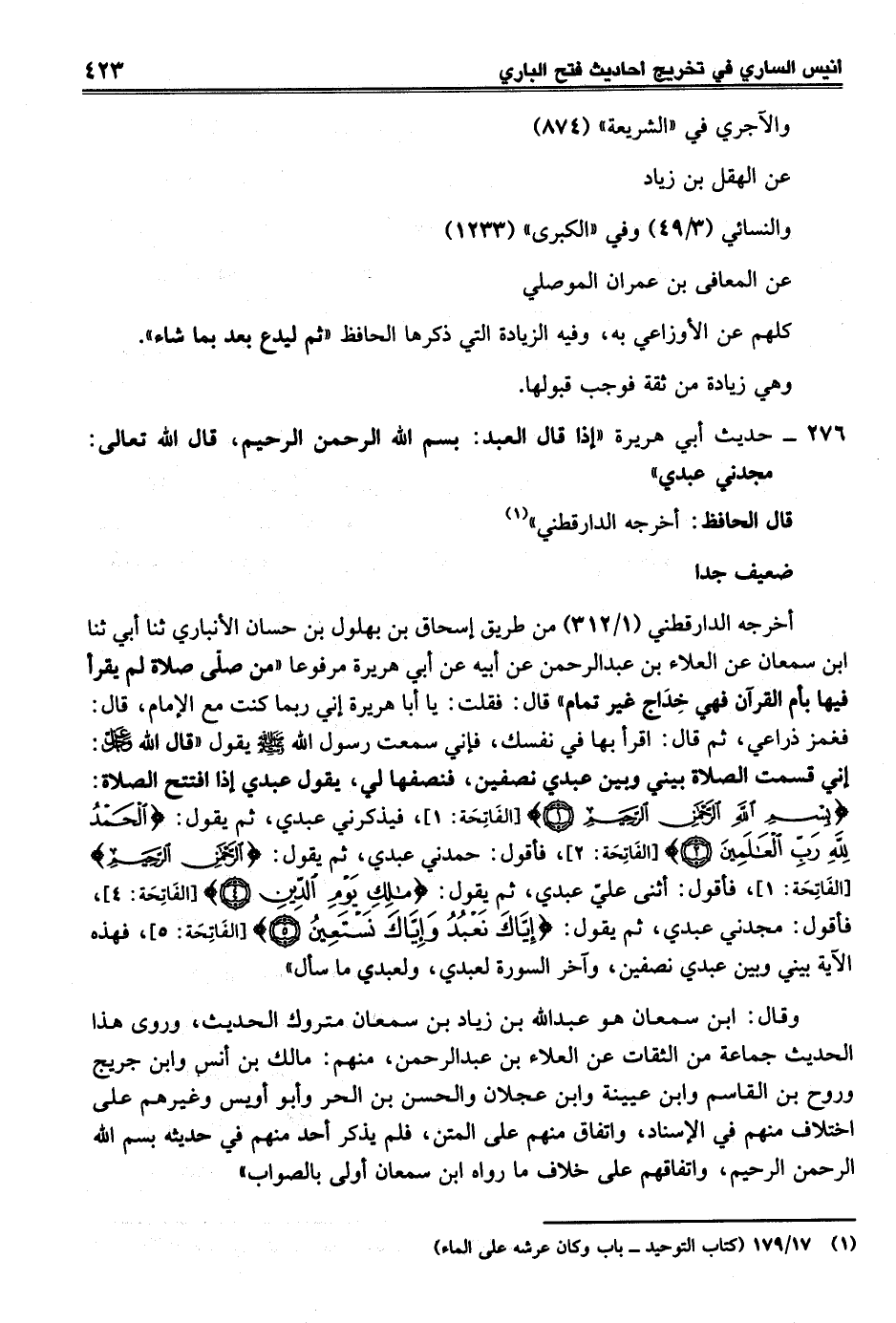 وقال: ابن سمعان هو عبد الله بن زياد بن سمعان متروك الحديث، وروى هذا الحديث جماعة من الثقات عن العلاء بن عبد الرحمن، منهم: مالك بن أنس وابن جريج وروح بن القاسم وابن عيينة وابن عجلان والحسن بن الحر وأبو أويس وغيرهم على اختلاف منهم في الإسناد، واتفاق منهم على المتن، فلم يذكر أحد منهم في حديثه بسم الله الرحمن الرحيم، واتفاقهم على خلاف ما رواه ابن سمعان أولى بالصواب"
