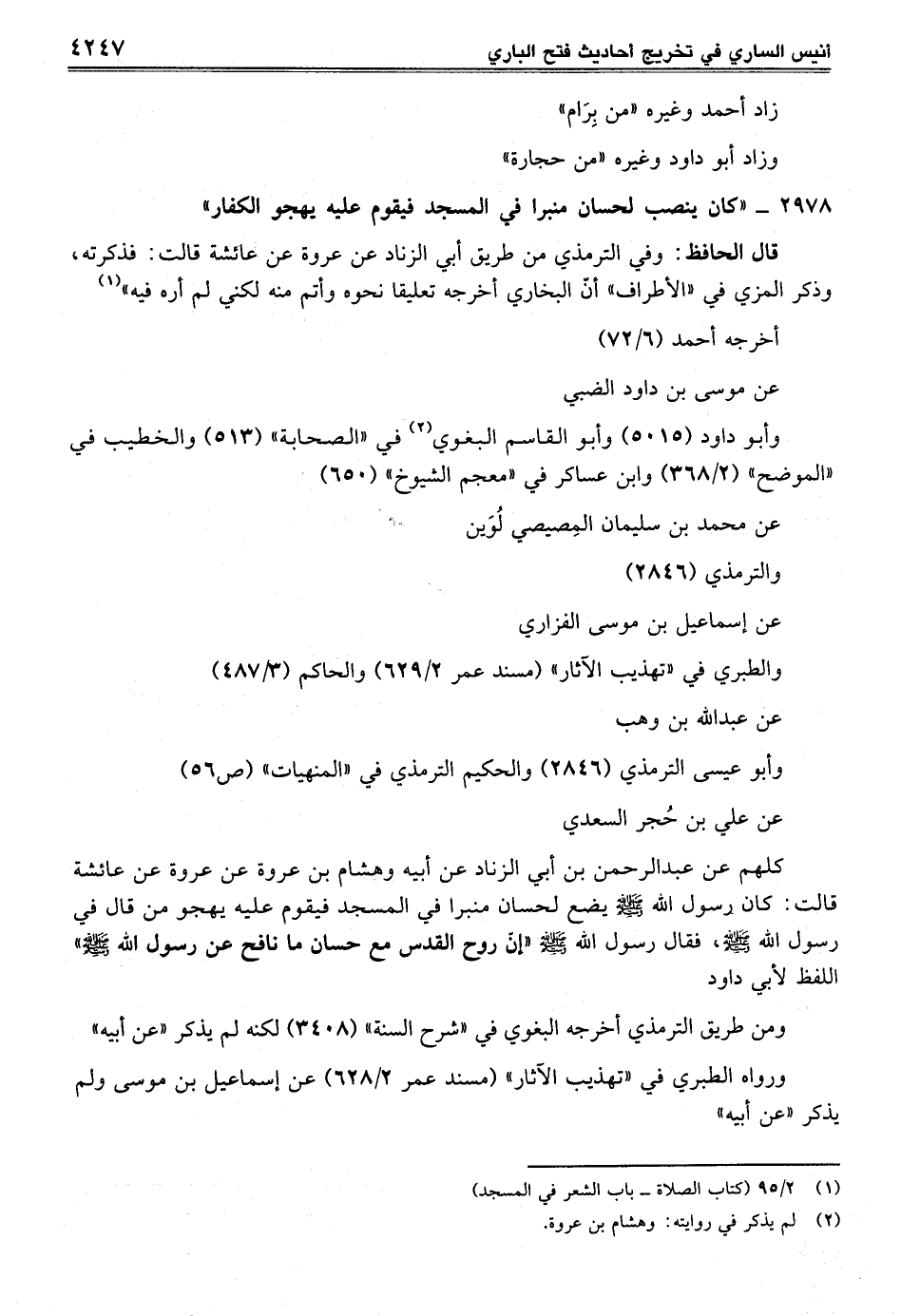 كلهم عن عبد الرحمن بن أبي الزناد عن أبيه وهشام بن عروة عن عروة عن عائشة قالت: كان رسول الله - صلى الله عليه وسلم - يضع لحسان منبرا في المسجد فيقوم عليه يهجو من قال في رسول الله - صلى الله عليه وسلم -، فقال رسول الله - صلى الله عليه وسلم - "إنّ روح القدس مع حسان ما نافح عن رسول الله - صلى الله عليه وسلم -" اللفظ لأبي داود