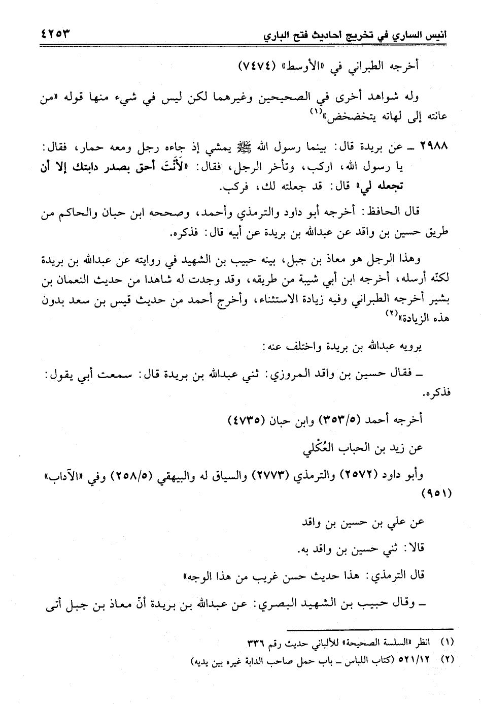 2988 - عن بريدة قال: بينما رسول الله - صلى الله عليه وسلم - يمشي إذ جاءه رجل ومعه حمار، فقال: يا رسول الله، اركب، وتأخر الرجل، فقال: "لَأَنْتَ أحق بصدر دابتك إلا أن تجعله لي" قال: قد جعلته لك، فركب.