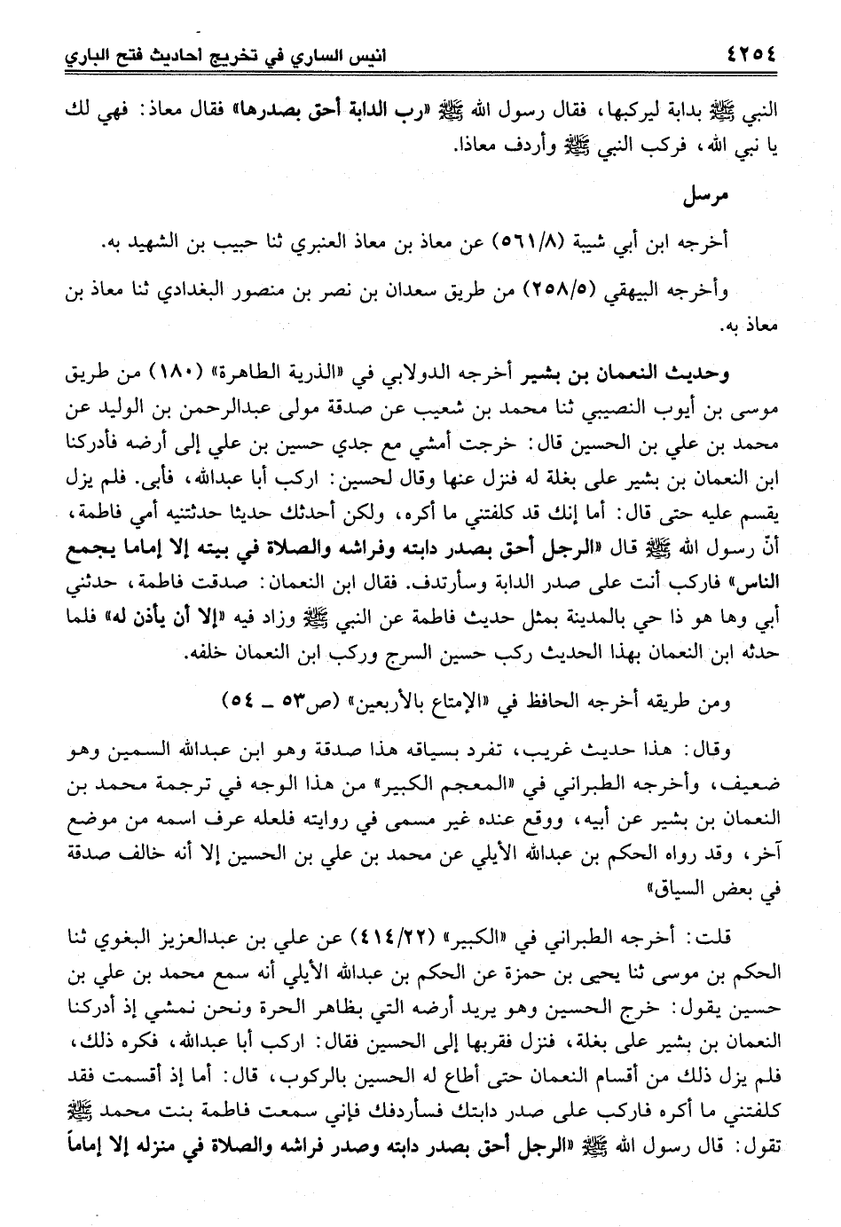 وحديث النعمان بن بشير أخرجه الدولابي في "الذرية الطاهرة" (180) من طريق موسى بن أيوب النصيبي ثنا محمد بن شعيب عن صدقة مولى عبد الرحمن بن الوليد عن محمد بن علي بن الحسين قال: خرجت أمشي مع جدي حسين بن علي إلى أرضه فأدركنا ابن النعمان بنّ بشير على بغلة له فنزل عنها وقال لحسين: اركب أبا عبد الله، فأبى. فلم يزل يقسم عليه حتى قال: أما إنك قد كلفتني ما أكره، ولكن أحدثك حديثا حدثتنيه أمي فاطمة، أنّ رسول الله - صلى الله عليه وسلم - قال "الرجل أحق بصدر دابته وفراشه والصلاة في بيته إلا إماما يجمع الناس" فاركب أنت على صدر الدابة وسأرتدف. فقال ابن النعمان: صدقت فاطمة، حدثني أبي وها هو ذا حي بالمدينة بمثل حديث فاطمة عن النبي - صلى الله عليه وسلم - وزاد فيه "إلا أن يأذن له" فلما حدثه ابن النعمان بهذا الحديث ركب حسين السرج وركب ابن النعمان خلفه.