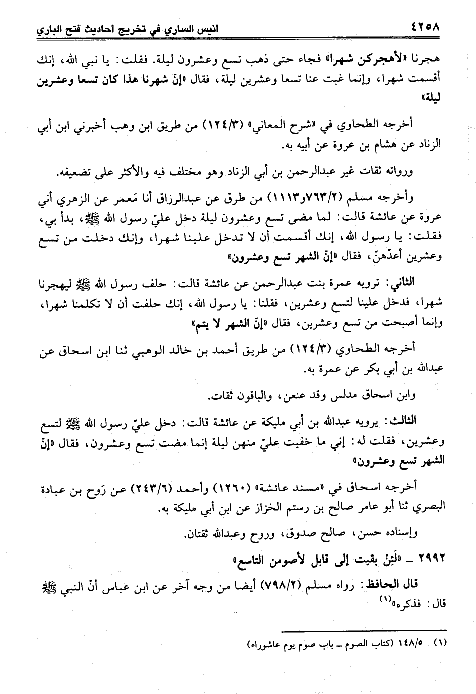 هجرنا "لأهجركن شهرا" فجاء حتى ذهب تسع وعشرون ليلة. فقلت: يا نبي الله، إنك أقسمت شهرا، وإنما غبت عنا تسعا وعشرين ليلة، فقال "إن شهرنا هذا كان تسعا وعشرين ليلة"
