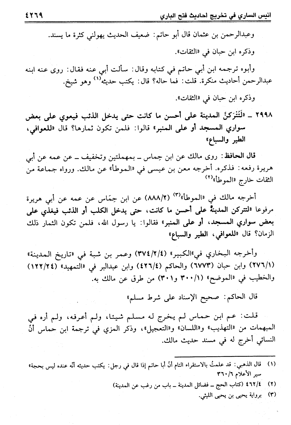 2998 - "لَتُتْرَكنَّ المدينة على أحسن ما كانت حتى يدخل الذئب فيعوي على بعض سواري المسجد أو على المنبر" قالوا: فلمن تكون ثمارها؟ قال "للعوافي، الطير والسباع"
