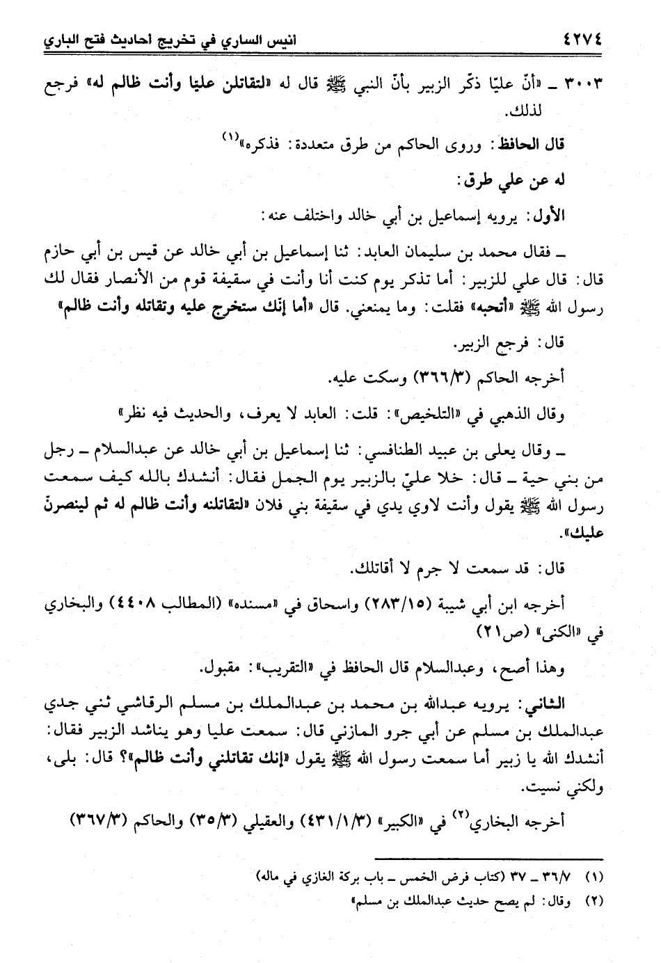 3003 - "أنّ عليّا ذكّر الزبير بأنّ النبي - صلى الله عليه وسلم - قال له "لتقاتلن عليًّا وأنت ظالم له" فرجع لذلك.