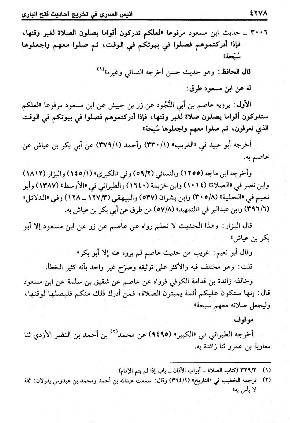 3006 - حديث ابن مسعود مرفوعاً "لعلكم تدركون أقواما يصلون الصلاة لغير وقتها، فإذا أدركتموهم فصلوا في بيوتكم في الوقت، ثم صلوا معهم واجعلوها سُبحة"