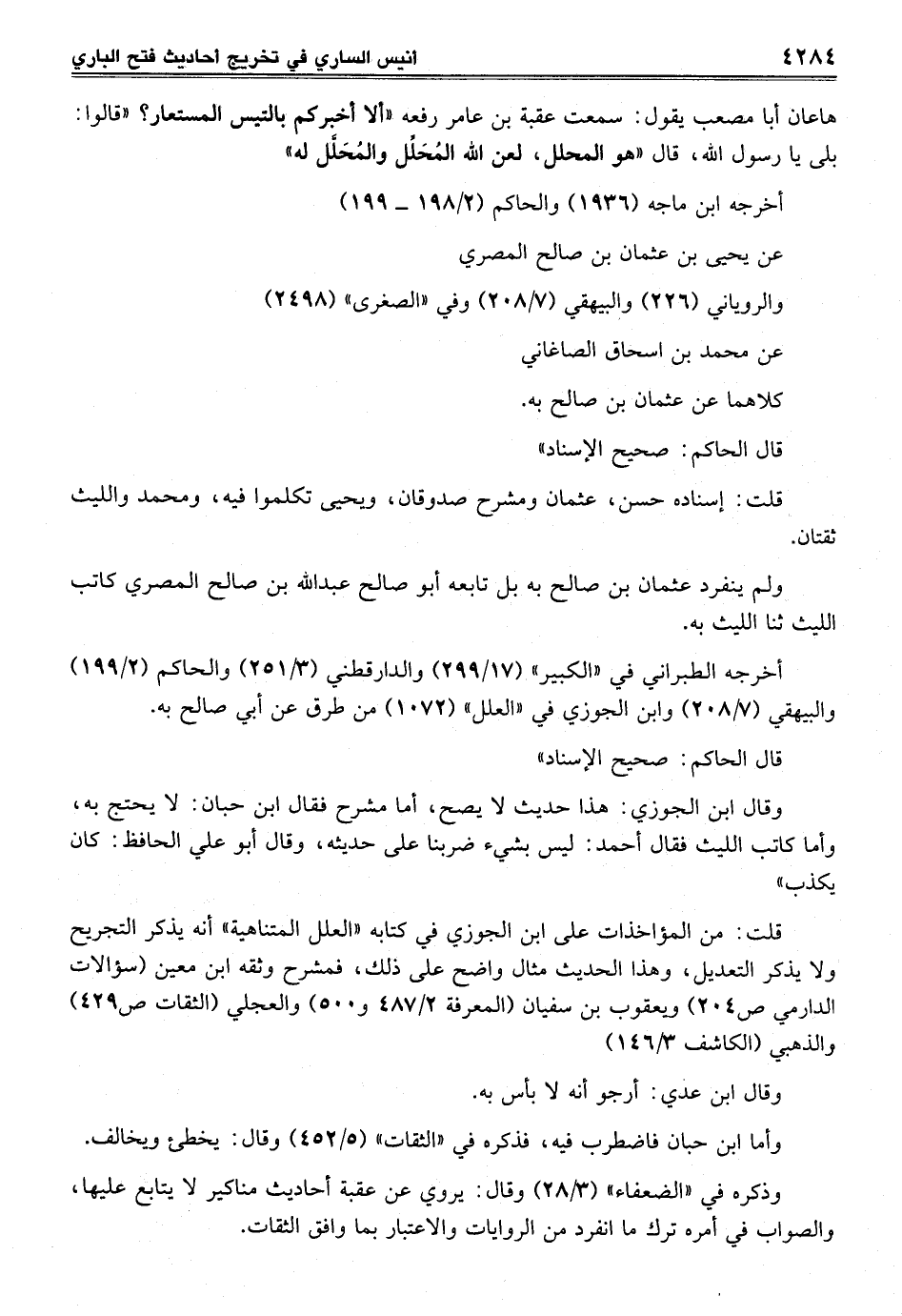 هاعان أبا مصعب يقول: سمعت عقبة بن عامر رفعه "ألا أخبركم بالتيس المستعار؟ "قالوا: بلى يا رسول الله، قال "هو المحلل، لعن الله المُحَلِّل والمُحَلَّل له"