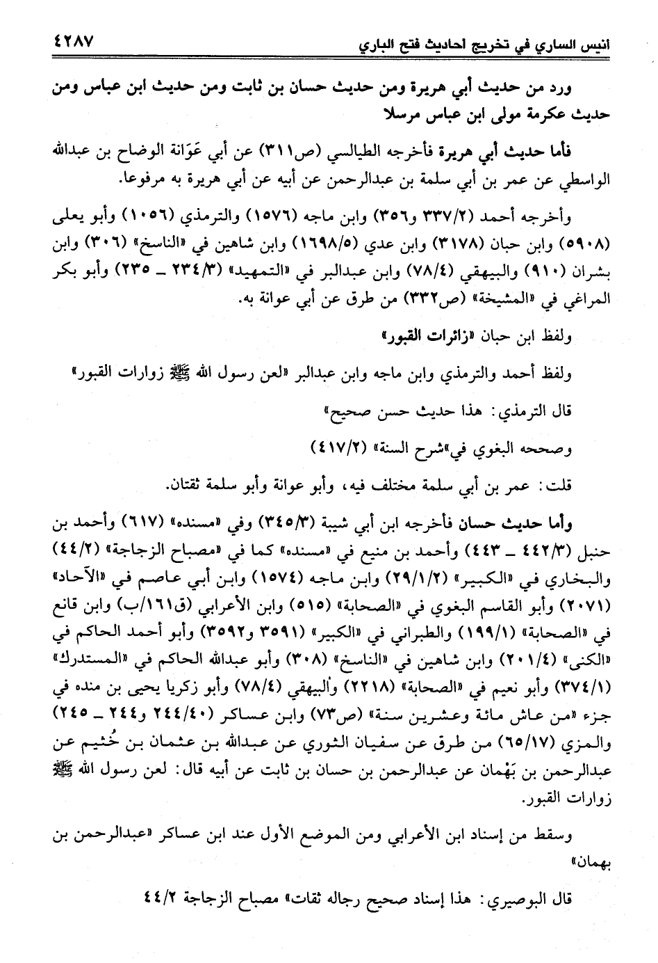 وأما حديث حسان فأخرجه ابن أبي شيبة (3/ 345) وفي "مسنده" (617) وأحمد بن حنبل (3/ 442 - 443) وأحمد بن منيع في "مسنده" كما في "مصباح الزجاجة" (2/ 44) والبخاري في "الكبير" (2/ 1/ 29) وابن ماجه (1574) وابن أبي عاصم في "الآحاد" (2071) وأبو القاسم البغوي في "الصحابة" (515) وابن الأعرابي (ق 161/ ب) وابن قانع في "الصحابة" (1/ 199) والطبراني في "الكبير" (3591 و 3592) وأبو أحمد الحاكم في "الكنى" (4/ 201) وابن شاهين في "الناسخ" (308) وأبو عبد الله الحاكم في "المستدرك" (1/ 374) وأبو نعيم في "الصحابة" (2218) والبيهقي (4/ 78) وأبو زكريا يحيى بن منده في جزء "من عاش مائة وعشرين سنة" (ص 73) وابن عساكر (40/ 244 و 244 - 245) والمزي (17/ 65) من طرق عن سفيان الثوري عن عبد الله بن عثمان بن خُثيم عن عبد الرحمن بن بَهْمان عن عبد الرحمن بن حسان بن ثابت عن أبيه قال: لعن رسول الله - صلى الله عليه وسلم - زوارات القبور.