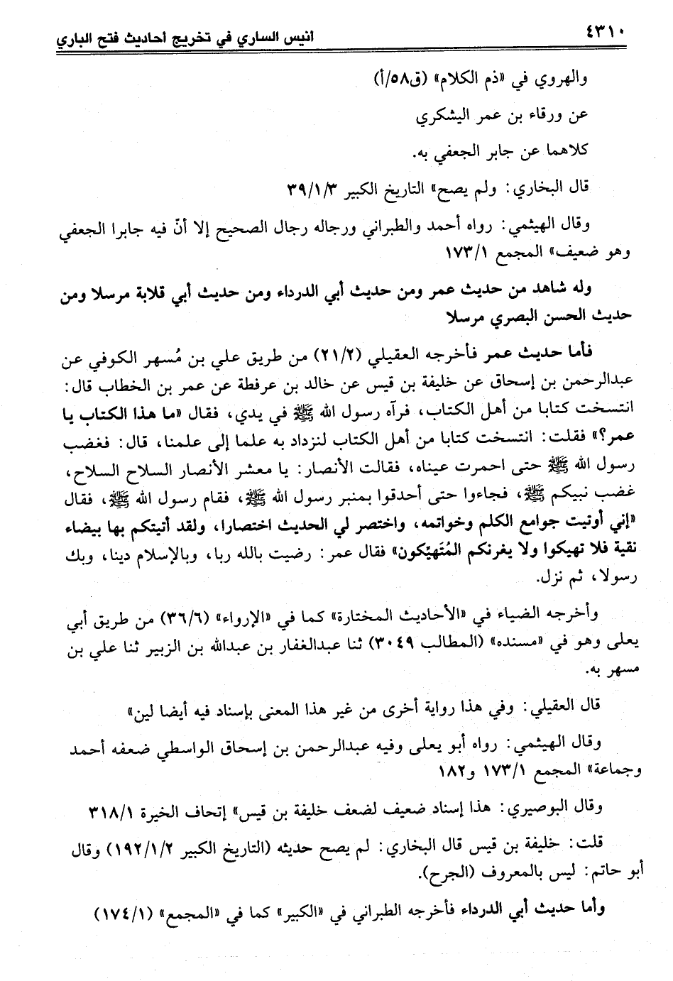فأما حديث عمر فأخرجه العقيلي (2/ 21) من طريق علي بن مُسهر الكوفي عن عبد الرحمن بن إسحاق عن خليفة بن قيس عن خالد بن عرفطة عن عمر بن الخطاب قال: انتسخت كتابا من أهل الكتاب، فرآه رسول الله - صلى الله عليه وسلم - في يدي، فقال "ما هذا الكتاب يا عمر؟ " فقلت: انتسخت كتابا من أهل الكتاب لنزداد به علماً إلى علمنا، قال: فغضب رسول الله - صلى الله عليه وسلم - حتى احمرت عيناه، فقالت الأنصار: يا معشر الأنصار السلاح السلاح، غضب نبيكم - صلى الله عليه وسلم -، فجاءوا حتى أحدقوا بمنبر رسول الله صلى الله عليه وسلم، فقام رسول الله صلى الله عليه وسلم، فقال "إني أوتيت جوامع الكلم وخواتمه، واختصر لي الحديث اختصارا، ولقد أتيتكم بها بيضاء نقية فلا تهيكوا ولا يغرنكم المُتَهيّكون" فقال عمر: رضيت بالله ربا، وبالإِسلام دينا، وبك رسولاً، ثم نزل.