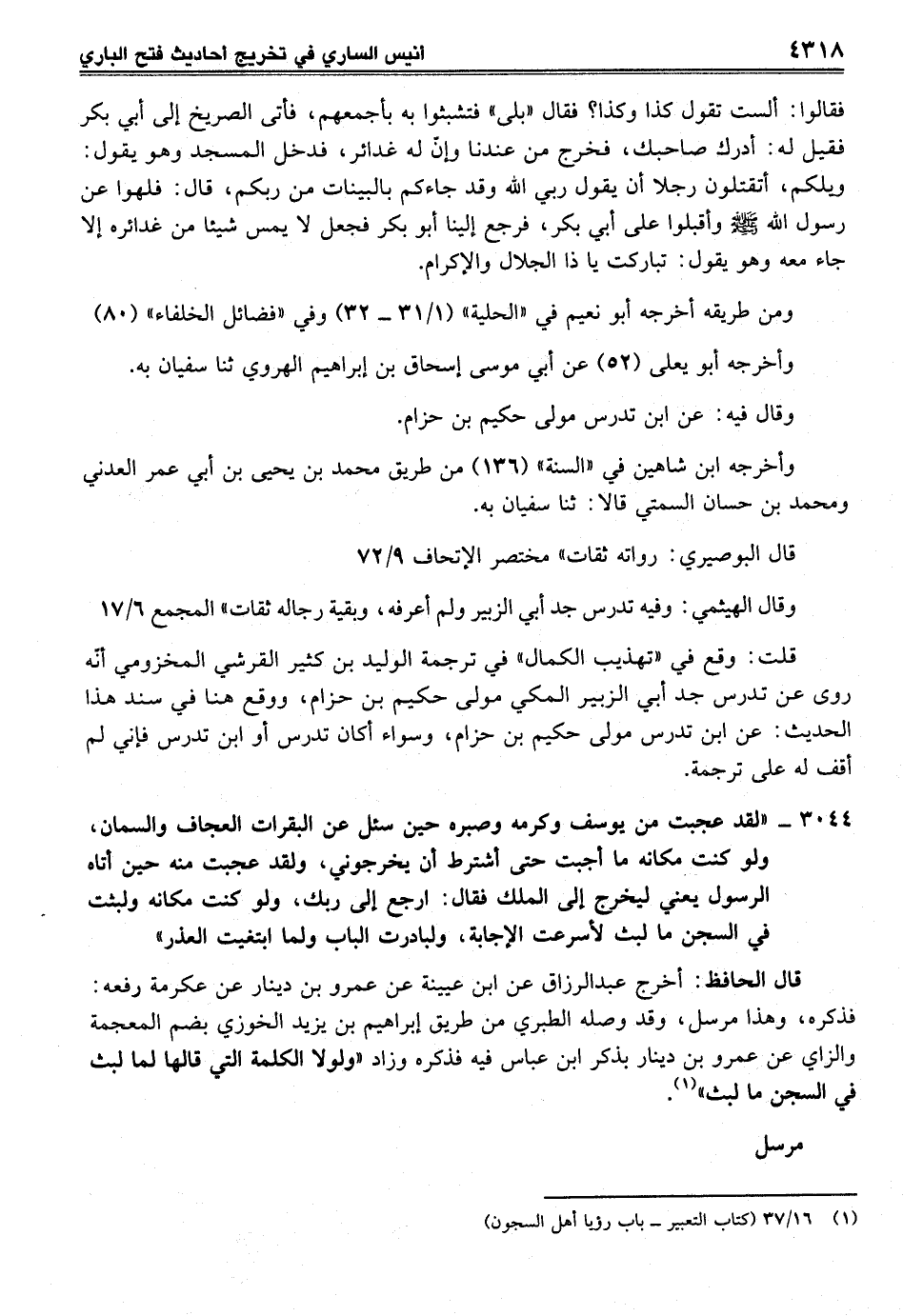 3044 - "لقد عجبت من يوسف وكرمه وصبره حين سئل عن البقرات العجاف والسمان، ولو كنت مكانه ما أجبت حتى أشترط أن يخرجوني، ولقد عجبت منه حين أتاه الرسول يعني ليخرج إلى الملك فقال: ارجع إلى ربك، ولو كنت مكانه ولبثت في السجن ما لبث لأسرعت الإجابة، ولبادرت الباب ولما ابتغيت العذر"