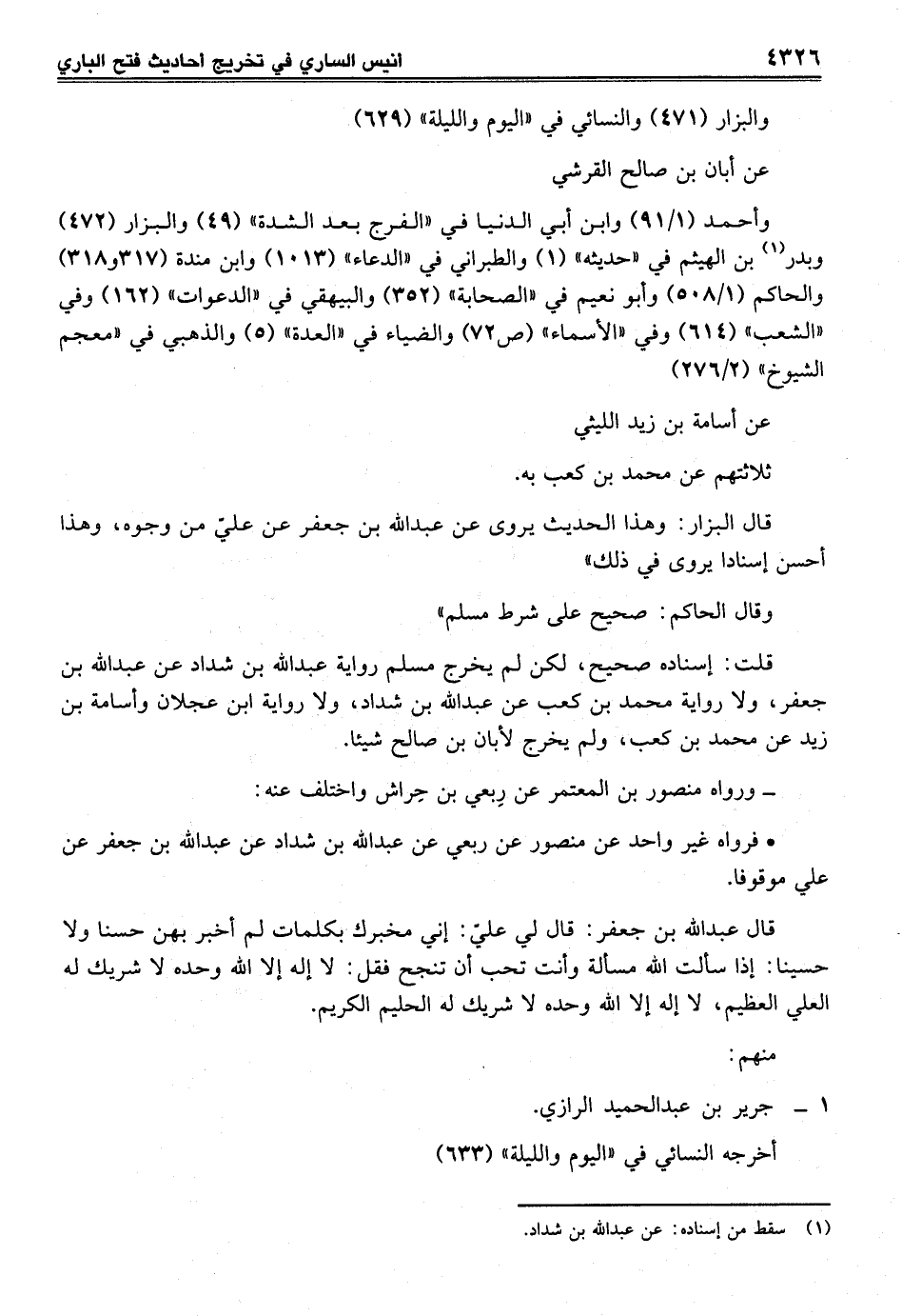 قلت: إسناده صحيح، لكن لم يخرج مسلم رواية عبد الله بن شداد عن عبد الله بن جعفر، ولا رواية محمد بن كعب عن عبد الله بن شداد، ولا رواية ابن عجلان وأسامة بن زيد عن محمد بن كعب، ولم يخرج لأبان بن صالح شيئاً.