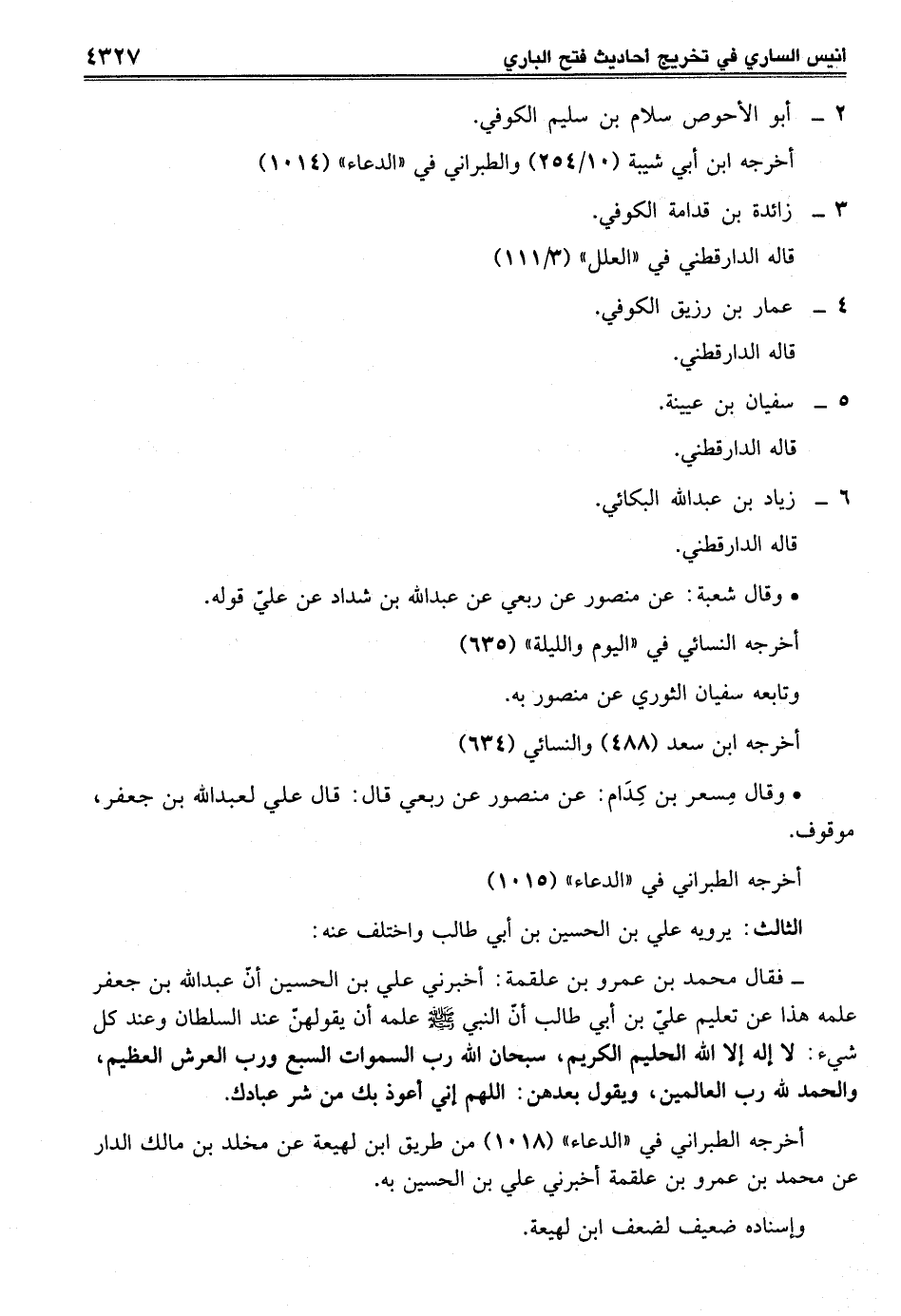 - فقال محمد بن عمرو بن علقمة: أخبرني علي بن الحسين أنّ عبد الله بن جعفر علمه هذا عن تعليم عليّ بن أبي طالب أنّ النبي - صلى الله عليه وسلم - علمه أن يقولهنّ عند السلطان وعند كل شيء: لا إله إلا الله الحليم الكريم، سبحان الله رب السماوات السبع ورب العرش العظيم، والحمد لله رب العالمين، ويقول بعدهن: اللهم إني أعوذ بك من شر عبادك.