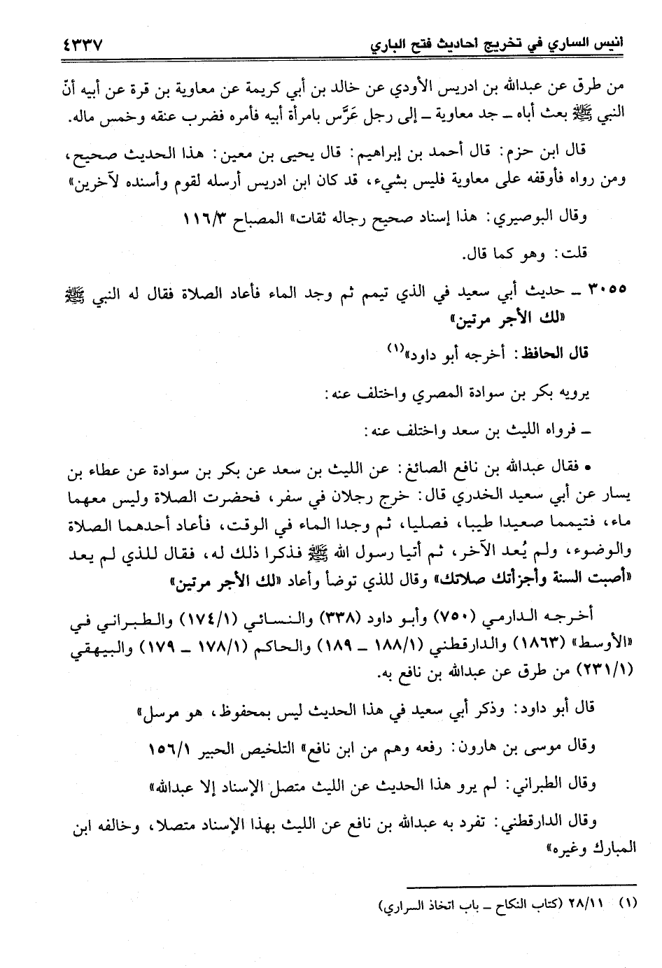 • فقال عبد الله بن نافع الصائغ: عن الليث بن سعد عن بكر بن سوادة عن عطاء بن يسار عن أبي سعيد الخدري قال: خرج رجلان في سفر، فحضرت الصلاة وليس معهما ماء، فتيمما صعيدا طيبا، فصليا، ثم وجدا الماء في الوقت، فأعاد أحدهما الصلاة والوضوء، ولم يُعد الآخر، ثم أتيا رسول الله - صلى الله عليه وسلم - فذكرا ذلك له، فقال للذي لم يعد "أصبت السنة وأجزأتك صلاتك" وقال للذي توضأ وأعاد "لك الأجر مرتين"