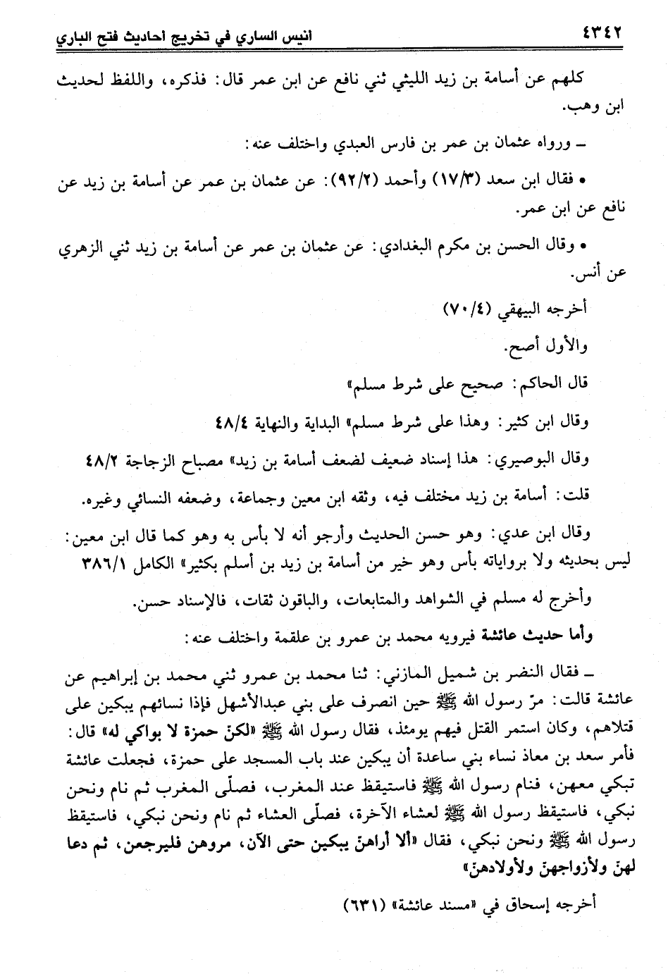 - فقال النضر بن شميل المازني: ثنا محمد بن عمرو ثني محمد بن إبراهيم عن عائشة قالت: مرّ رسول الله - صلى الله عليه وسلم - حين انصرف على بني عبد الأشهل فإذا نسائهم يبكين على قتلاهم، وكان استمر القتل فيهم يومئذ، فقال رسول الله - صلى الله عليه وسلم - "لكن حمزة لا بواكي له" قال: فأمر سعد بن معاذ نساء بني ساعدة أن يبكين عند باب المسجد على حمزة، فجعلت عائشة تبكي معهن، فنام رسول الله صلى الله عليه وسلم فاستيقظ عند المغرب، فصلّى المغرب ثم نام ونحن نبكي، فاستيقظ رسول الله صلى الله عليه وسلم لعشاء الآخرة، فصلّى العشاء ثم نام ونحن نبكي، فاستيقظ رسول الله - صلى الله عليه وسلم - ونحن نبكي، فقال "ألا أراهنّ يبكين حتى الآن، مروهن فليرجعن، ثم دعا لهن ولأزواجهن ولأولادهنّ"
