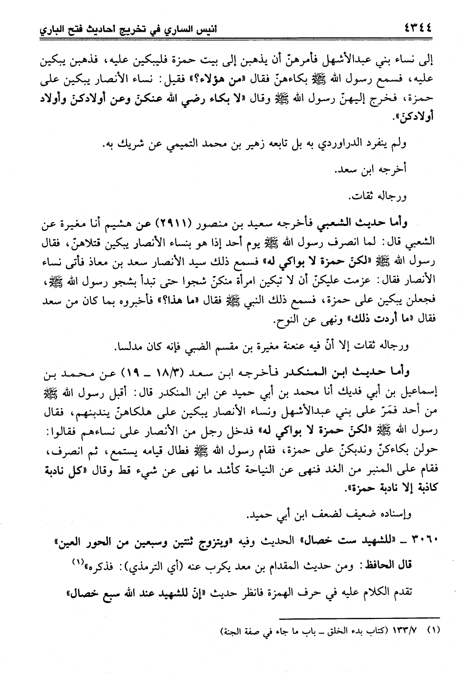 وأما حديث الشعبي فأخرجه سعيد بن منصور (2911) عن هشيم أنا مغيرة عن الشعبي قال: لما انصرف رسول الله - صلى الله عليه وسلم - يوم أحد إذا هو بنساء الأنصار يبكين قتلاهنّ، فقال رسول الله صلى الله عليه وسلم "لكنّ حمزة لا بواكي له" فسمع ذلك سيد الأنصار سعد بن معاذ فأتى نساء الأنصار فقال: عزمت عليكنّ أن لا تبكين امرأة منكنّ شجوا حتى تعبداً بشجو رسول الله صلى الله عليه وسلم، فجعلن يبكين على حمزة، فسمع ذلك النبي - صلى الله عليه وسلم - فقال "ما هذا؟ " فأخبروه بما كان من سعد فقال "ما أردت ذلك" ونهى عن النوح.